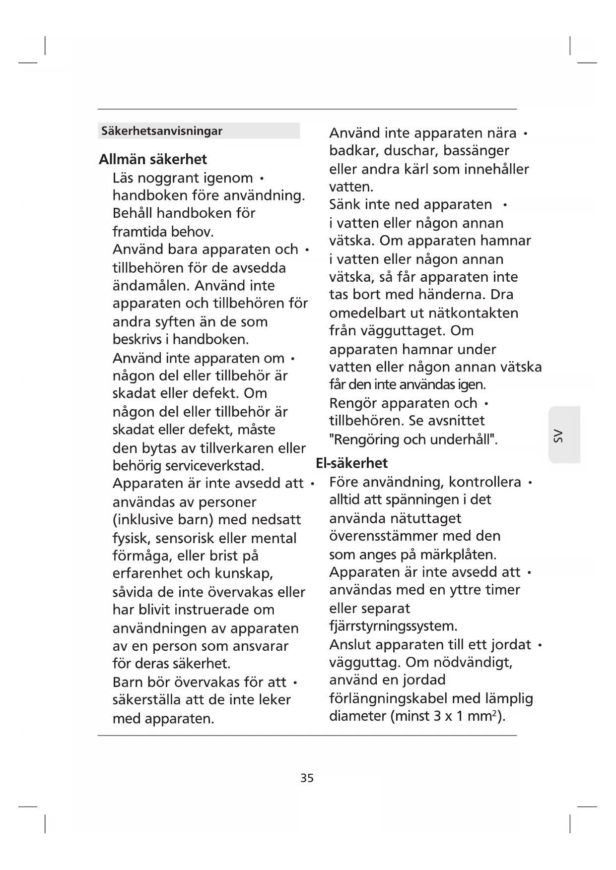 Säkerhetsanvisningar Allmän säkerhet Läs noggrant igenom • handboken före användning. Behåll handboken för framtida behov. Använd bara apparaten och • tillbehören för de avsedda ändamålen. Använd inte apparaten och tillbehören för andra syften än de som beskrivs i handboken. Använd inte apparaten om • någon del eller tillbehör är skadat eller defekt. Om någon del eller tillbehör är skadat eller defekt, måste den bytas av tillverkaren eller behörig serviceverkstad. Apparaten är inte avsedd att • användas av personer (inklusive barn) med nedsatt fysisk, sensorisk eller mental förmåga, eller brist på erfarenhet och kunskap, såvida de inte övervakas eller har blivit instruerade om användningen av apparaten av en person som ansvarar för deras säkerhet. Barn bör övervakas för att • säkerställa att de inte leker med apparaten. Använd inte apparaten nära • badkar, duschar, bassänger eller andra kärl som innehåller vatten. Sänk inte ned apparaten • i vatten eller någon annan vätska. Om apparaten hamnar i vatten eller någon annan vätska, så får apparaten inte tas bort med händerna. Dra omedelbart ut nätkontakten från vägguttaget. Om apparaten hamnar under vatten eller någon annan vätska får den inte användas igen. Rengör apparaten och • tillbehören. Se avsnittet "Rengöring och underhåll". El-säkerhet Före användning, kontrollera • alltid att spänningen i det använda nätuttaget överensstämmer med den som anges på märkplåten. Apparaten är inte avsedd att • användas med en yttre timer eller separat fjärrstyrningssystem. Anslut apparaten till ett jordat • vägguttag. Om nödvändigt, använd en jordad förlängningskabel med lämplig diameter (minst 3 x 1 mm