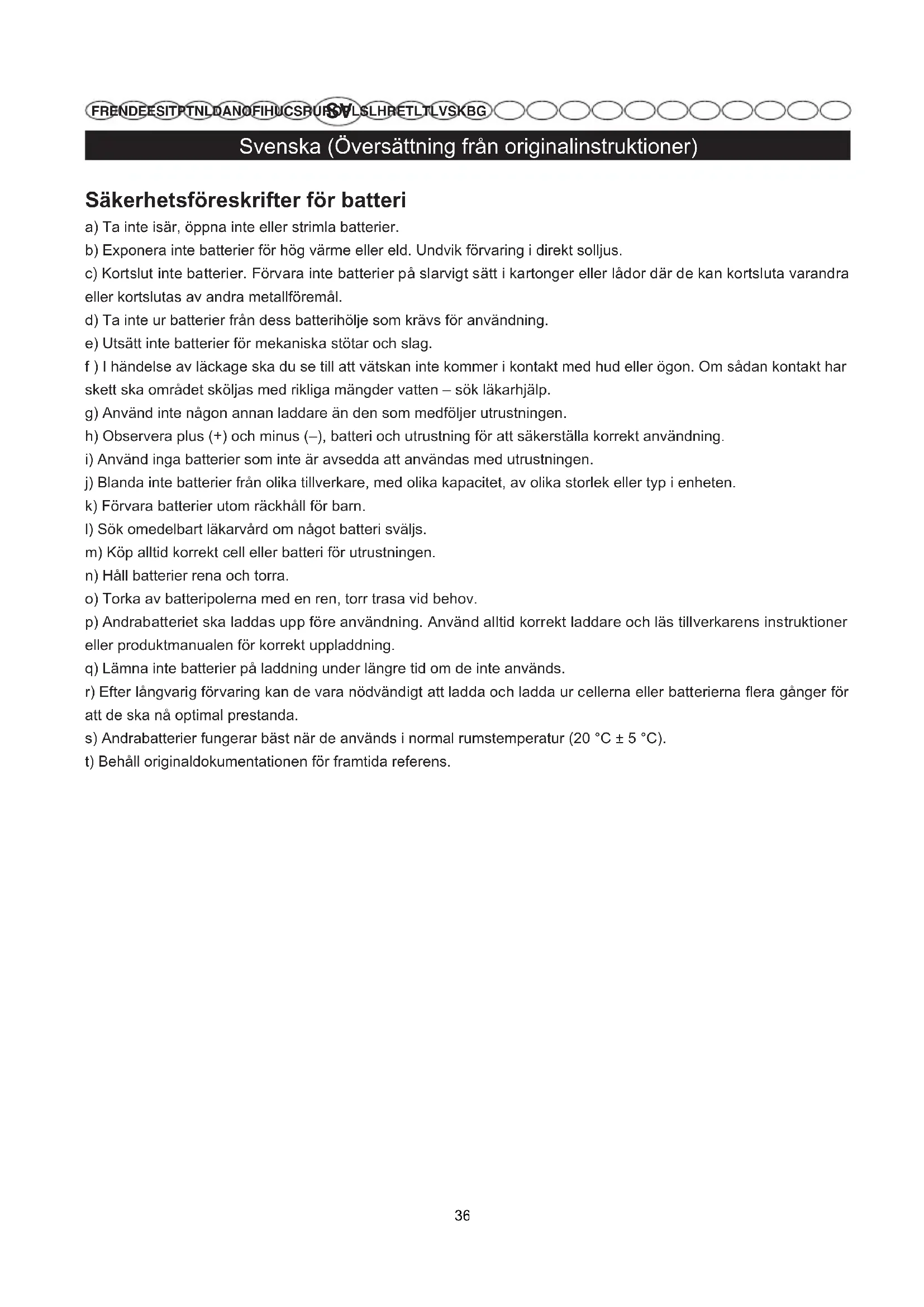 j) Blanda inte batterier från olika tillverkare, med olika kapacitet, av olika storlek eller typ i enheten. k) Förvara batterier utom räckhåll för barn. l) Sök omedelbart läkarvård om något batteri sväljs. m) Köp alltid korrekt cell eller batteri för utrustningen. n) Håll batterier rena och torra. o) Torka av batteripolerna med en ren, torr trasa vid behov. p) Andrabatteriet ska laddas upp före användning. Använd alltid korrekt laddare och läs tillverkarens instruktioner eller produktmanualen för korrekt uppladdning. q) Lämna inte batterier på laddning under längre tid om de inte används. r) Efter långvarig förvaring kan de vara nödvändigt att ladda och ladda ur cellerna eller batterierna flera gånger för att de ska nå optimal prestanda. s) Andrabatterier fungerar bäst när de används i normal rumstemperatur (20 °C ± 5 °C). t) Behåll originaldokumentationen för framtida referens.