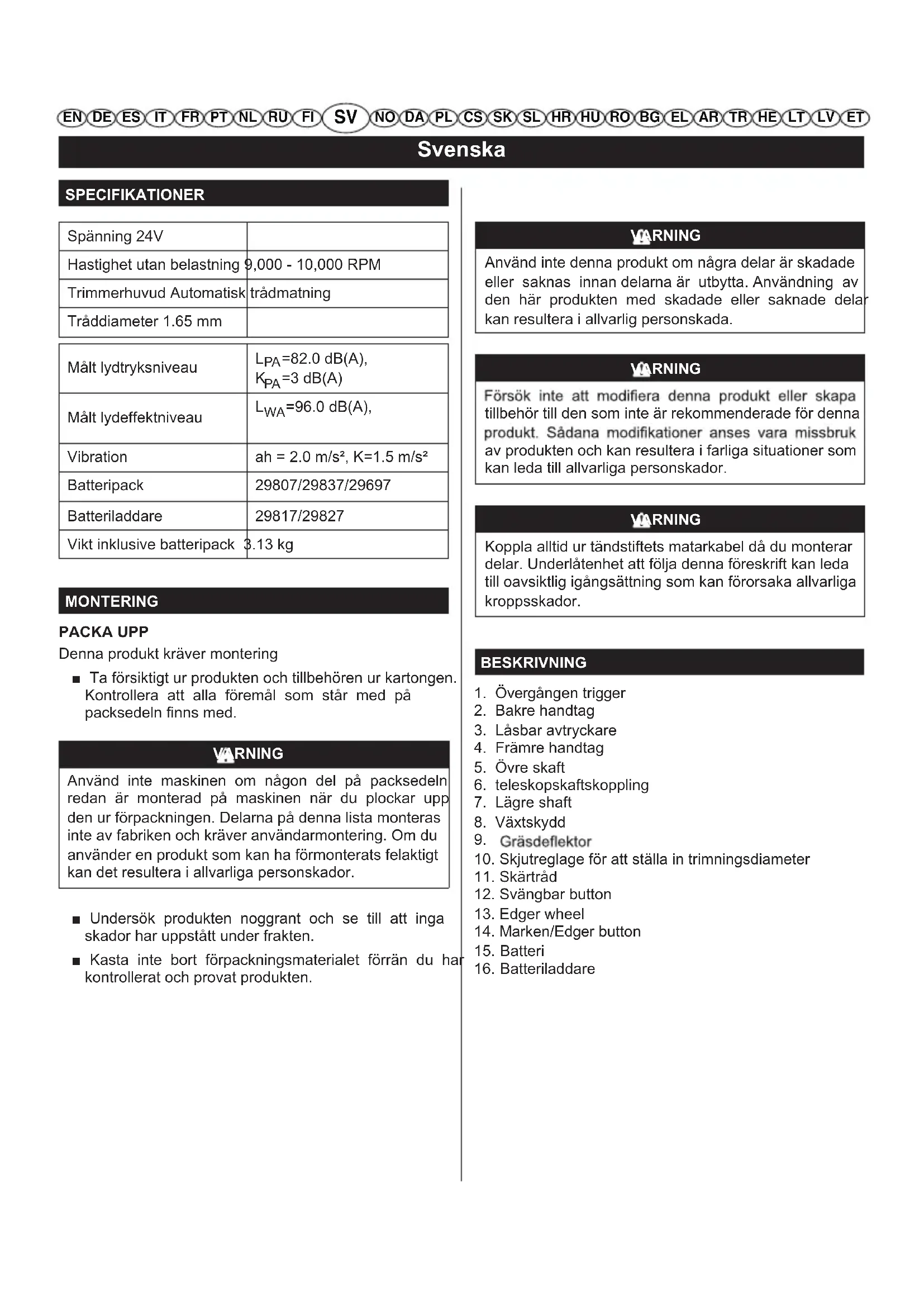 EN DE ES IT FR PT NL RU SV NO DA PL CS SK SL HR HU RO BG EL AR TR HE LT LV ETSvenska SPECIFIKATIONER Spänning 24V Hastighet utan belastning 9,000 - 10,000 RPM Trimmerhuvud Automatisk trådmatning Tråddiameter 1.65 mm MONTERING PACKA UPP Denna produkt kräver montering ■ Ta försiktigt ur produkten och tillbehören ur kartongen. Kontrollera att alla föremål som står med på packsedeln finns med. VARNING Använd inte maskinen om någon del på packsedeln redan är monterad på maskinen när du plockar upp den ur förpackningen. Delarna på denna lista monteras inte av fabriken och kräver användarmontering. Om du använder en produkt som kan ha förmonterats felaktigt kan det resultera i allvarliga personskador. ■ Undersök produkten noggrant och se till att inga skador har uppstått under frakten. ■ Kasta inte bort förpackningsmaterialet förrän du har kontrollerat och provat produkten. VARNING Använd inte denna produkt om några delar är skadade eller saknas innan delarna är utbytta. Användning av den här produkten med skadade eller saknade delar kan resultera i allvarlig personskada. VARNING tillbehör till den som inte är rekommenderade för denna av produkten och kan resultera i farliga situationer som kan leda till allvarliga personskador. VARNING Koppla alltid ur tändstiftets matarkabel då du monterar delar. Underlåtenhet att följa denna föreskrift kan leda till oavsiktlig igångsättning som kan förorsaka allvarliga kroppsskador. BESKRIVNING