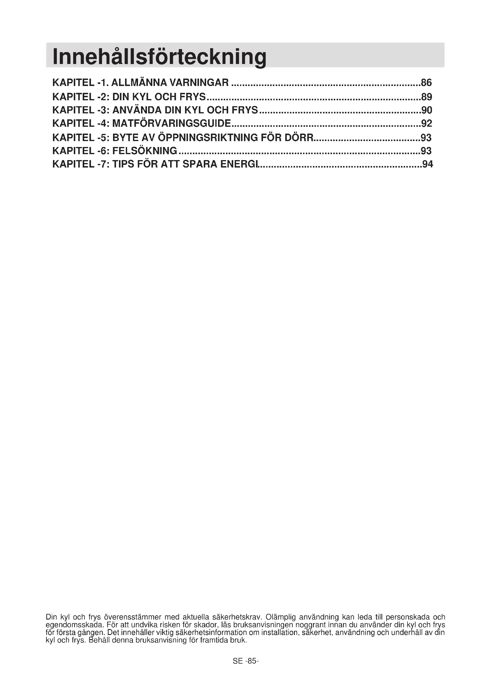 Din kyl och frys överensstämmer med aktuella säkerhetskrav. Olämplig användning kan leda till personskada och egendomsskada. För att undvika risken för skador, läs bruksanvisningen noggrant innan du använder din kyl och frys för första gången. Det innehåller viktig säkerhetsinformation om installation, säkerhet, användning och underhåll av din kyl och frys. Behåll denna bruksanvisning för framtida bruk. Innehållsförteckning