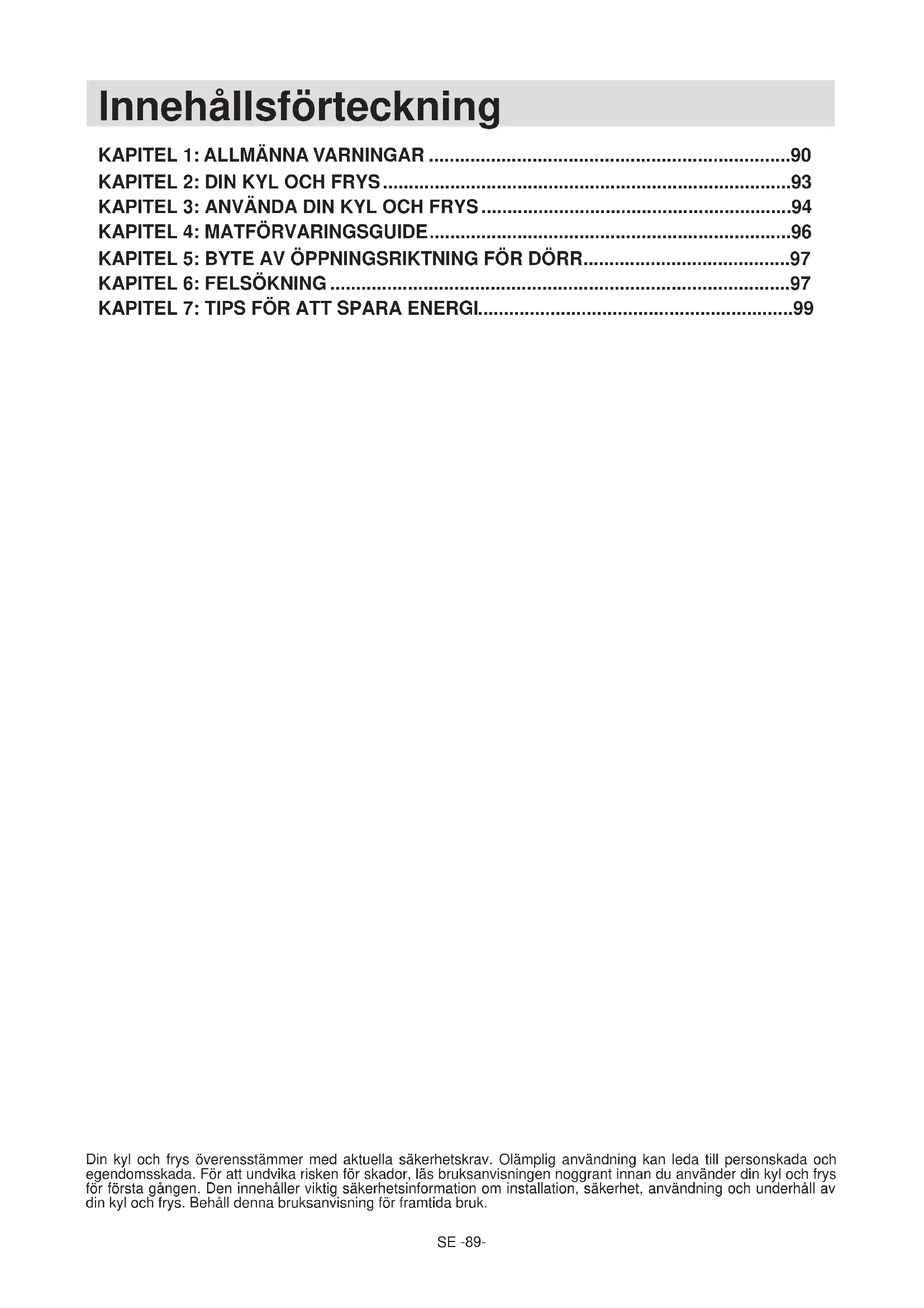 Din kyl och frys överensstämmer med aktuella säkerhetskrav. Olämplig användning kan leda till personskada och egendomsskada. För att undvika risken för skador, läs bruksanvisningen noggrant innan du använder din kyl och frys för första gången. Den innehåller viktig säkerhetsinformation om installation, säkerhet, användning och underhåll av din kyl och frys. Behåll denna bruksanvisning för framtida bruk. Innehållsförteckning