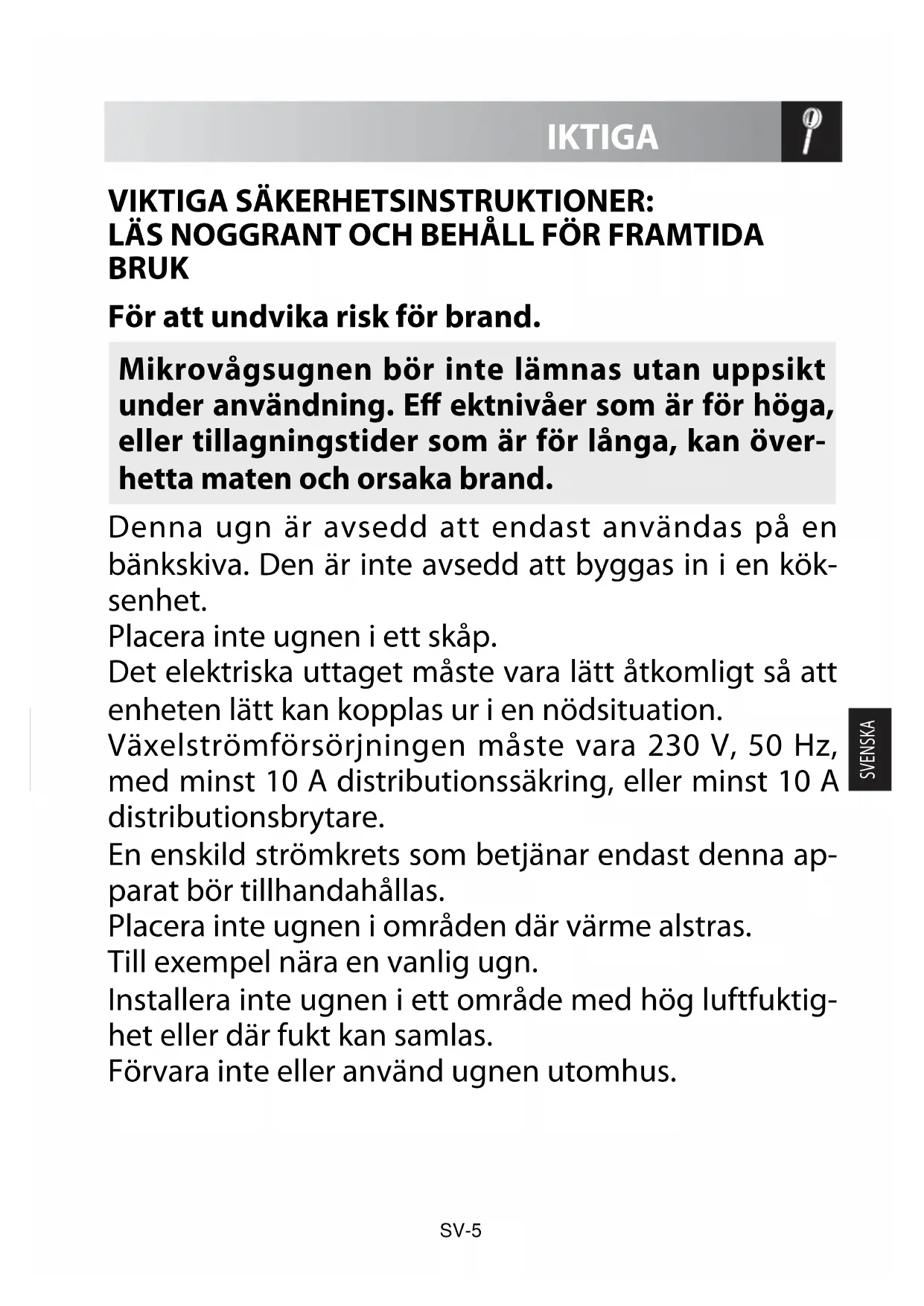 För att undvika risk för brand. Mikrovågsugnen bör inte lämnas utan uppsikt under användning. E ektnivåer som är för höga, eller tillagningstider som är för långa, kan över- hetta maten och orsaka brand. Denna ugn är avsedd att endast användas på en bänkskiva. Den är inte avsedd att byggas in i en kök- senhet. Placera inte ugnen i ett skåp. Det elektriska uttaget måste vara lätt åtkomligt så att enheten lätt kan kopplas ur i en nödsituation. Växelströmförsörjningen måste vara 230 V, 50 Hz, med minst 10 A distributionssäkring, eller minst 10 A distributionsbrytare. En enskild strömkrets som betjänar endast denna ap- parat bör tillhandahållas. Placera inte ugnen i områden där värme alstras. Till exempel nära en vanlig ugn. Installera inte ugnen i ett område med hög luftfuktig- het eller där fukt kan samlas. Förvara inte eller använd ugnen utomhus. VIKTIGA SÄKERHETSINSTRUKTIONER: LÄS NOGGRANT OCH BEHÅLL FÖR FRAMTIDA BRUK SV-5Om rök observeras, slå av eller koppla ur ugnen och håll luckan stängd för att kväva eventuella ammor. Använd endast mikrovågssäkra behållare och redskap. Se sidan SE-25. Redskap bör kontrolleras för att säkerställa att de är lämpliga för användning i mikrovågsugnar. Vid uppvärmning av mat i plast- eller pappersbe- hållare, övervaka ugnen på grund av risken för antändning. Rengör vågledarskyddet, ugnsutrymmet, den roterande tallriken och vändfoten efter använd- ning. Dessa måste vara torra och fria från fett. Gammalt fett kan överhettas och börja ryka eller fatta eld. Placera inte lättantändliga material nära ugnen eller ventilationsöppningarna. Blockera inte ventilationsöppningarna. Ta bort alla metalltätningar, påsklämmor, etc., från livsmedel och förpackningar. Gnista på metallytor kan orsaka brand. Använd inte mikrovågsugnen för att värma olja till fri- tering. Temperaturen kan inte kontrolleras och oljan kan fatta eld. För att göra popcorn, använd bara speciella mikro- vågsugnpopcornstillverkare. Förvara inte mat eller andra föremål inuti ugnen. Kontrollera inställningarna när du startar ugnen för att säkerställa att ugnen fungerar som du önskar. SV-6