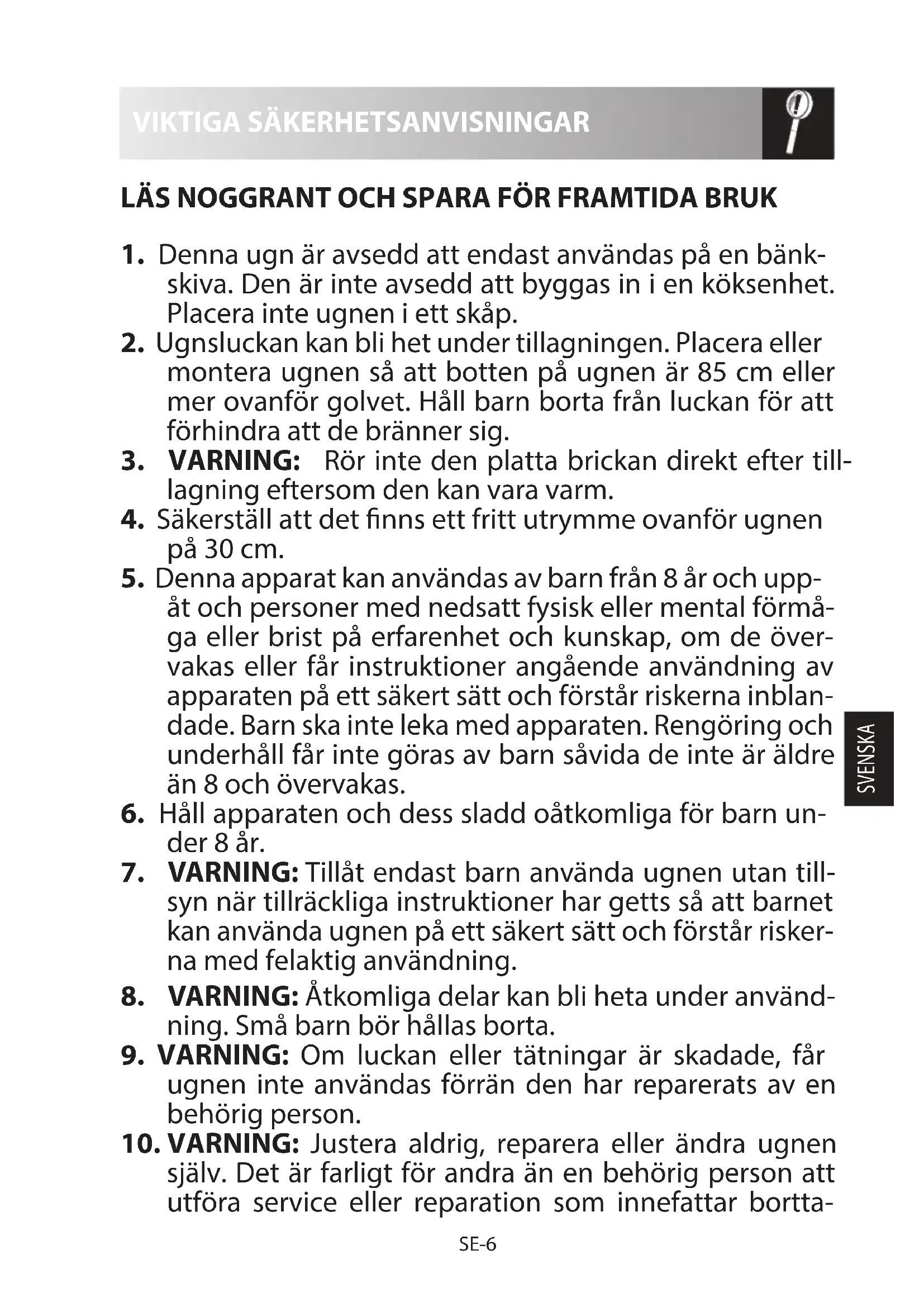 10. VARNING: Justera aldrig, reparera eller ändra ugnen
