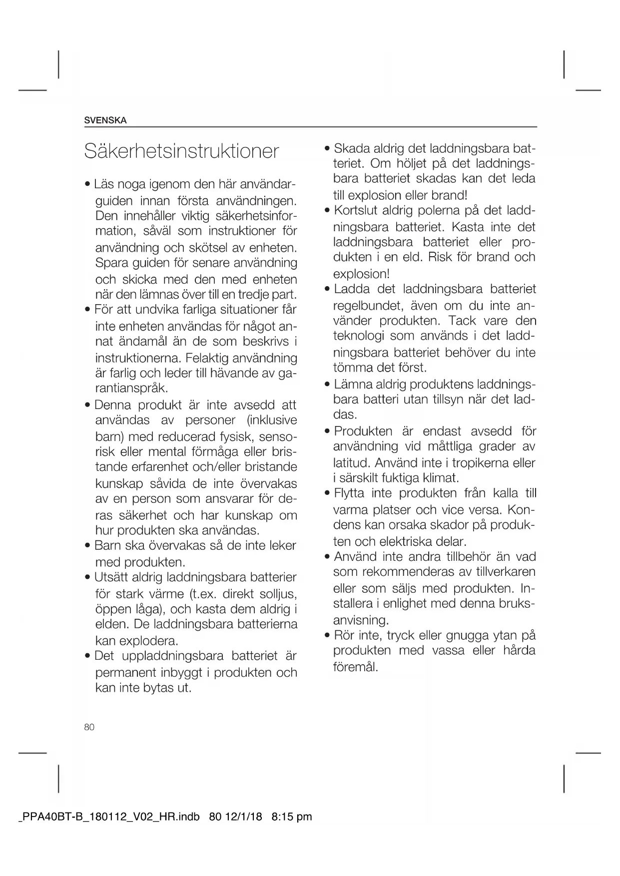 - Läs denna användarguide noggrant för att undvika skador eller olyckor på grund av felaktiv användning. Uppmärksamma särskilt säkerhets- instruktionerna. IM_PPA40BT-B_180112_V02_HR.indb 82 12/1/18 8:15 pm83 SVENSKA