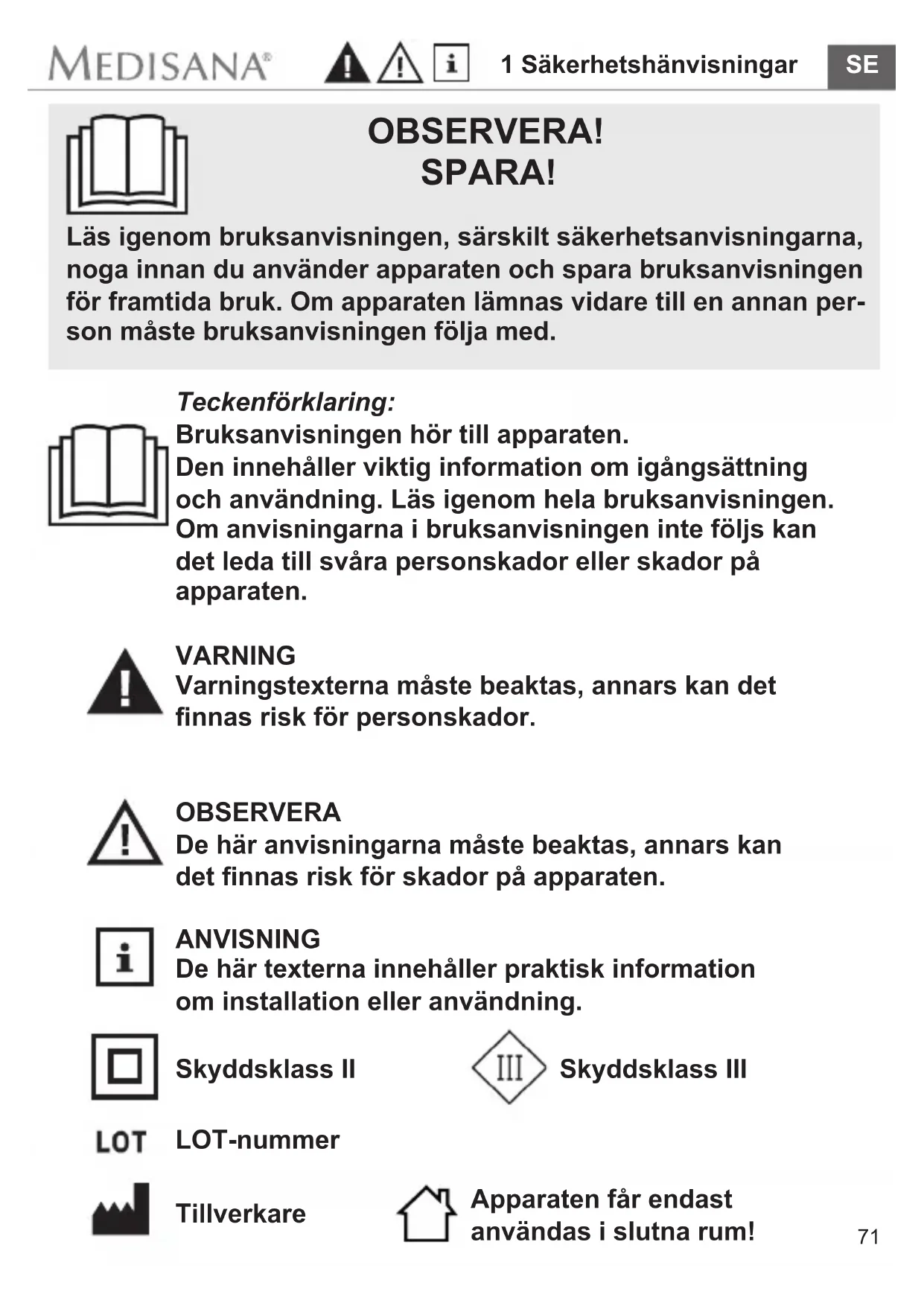 Tillverkare Skyddsklass II Skyddsklass III Apparaten får endast användas i slutna rum!72 1 Säkerhetshänvisningar
