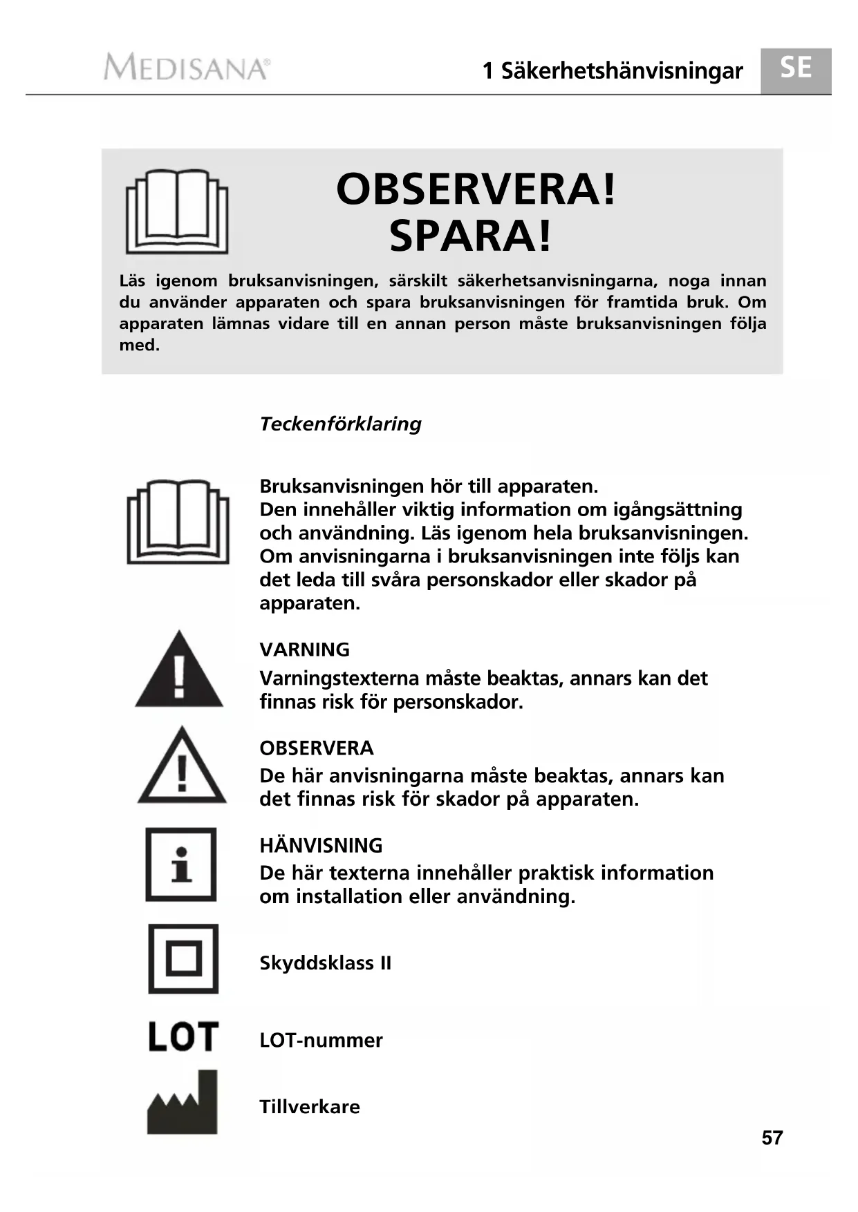 - Om nätkabeln är skadad får den endast bytas ut av MEDISANA, auktoriserade återförsäljare eller motsvarande behörig person.