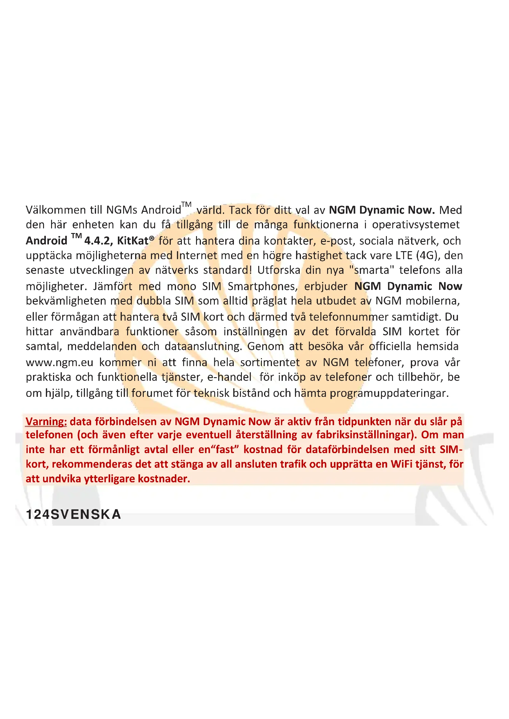 upptäcka möjligheterna med Internet med en högre hastighet tack vare LTE (4G), den senaste utvecklingen av nätverks standard! Utforska din nya "smarta" telefons alla möjligheter. Jämfört med mono SIM Smartphones, erbjuder NGM Dynamic Now bekvämligheten med dubbla SIM som alltid präglat hela utbudet av NGM mobilerna, eller förmågan att hantera två SIM kort och därmed två telefonnummer samtidigt. Du hittar användbara funktioner såsom inställningen av det förvalda SIM kortet för samtal, meddelanden och dataanslutning. Genom att besöka vår officiella hemsida www.ngm.eu kommer ni att finna hela sortimentet av NGM telefoner, prova vår praktiska och funktionella tjänster, e-handel för inköp av telefoner och tillbehör, be om hjälp, tillgång till forumet för teknisk bistånd och hämta programuppdateringar.