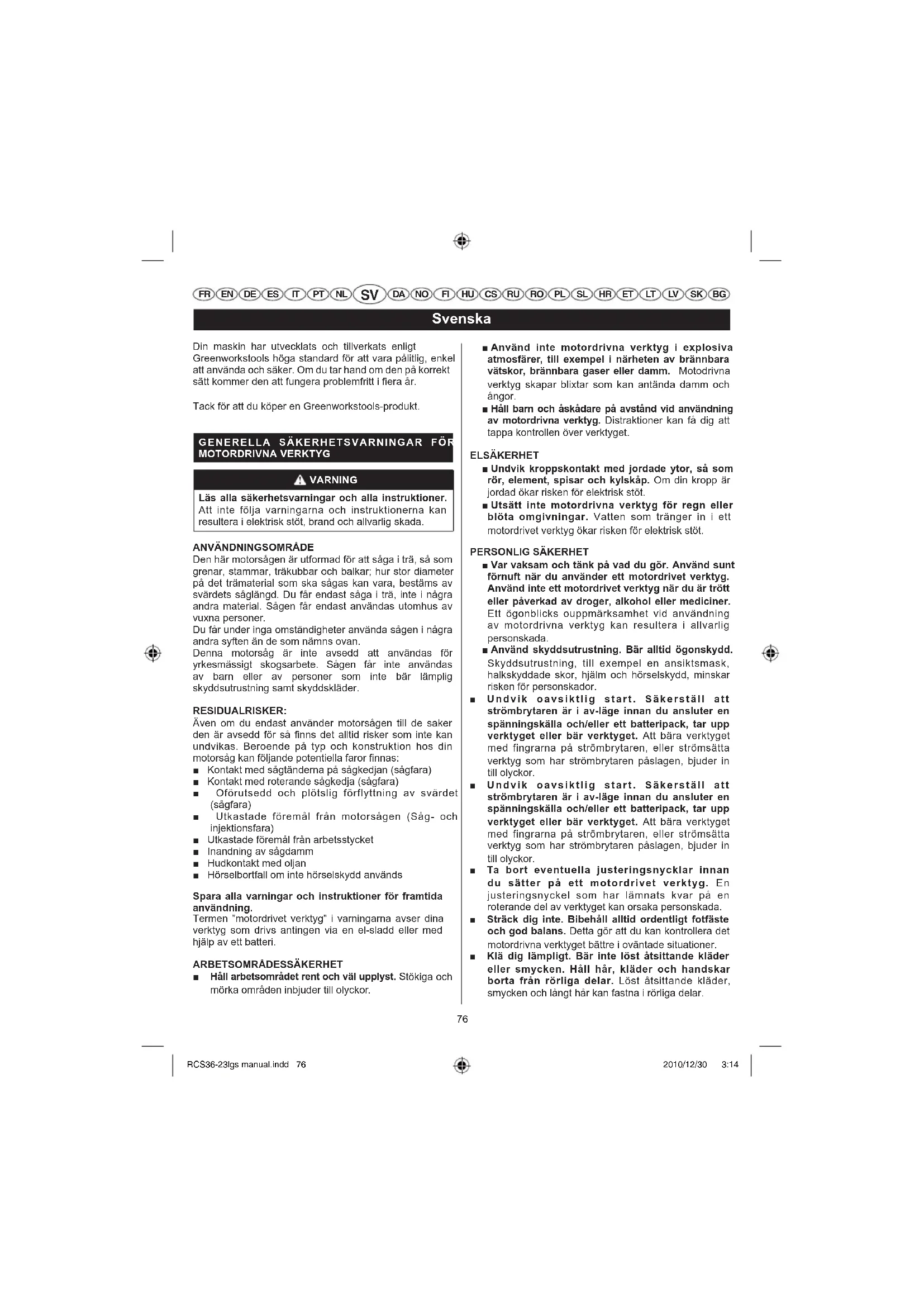 FR EN DE ES IT PT NL DA NO FI HU CS RU RO PL SL HR ET LT LV SK BG Din maskin har utvecklats och tillverkats enligt Greenworkstools höga standard för att vara pålitlig, enkel att använda och säker. Om du tar hand om den på korrekt sätt kommer den att fungera problemfritt i fiera år. Tack för att du köper en Greenworkstools-produkt.