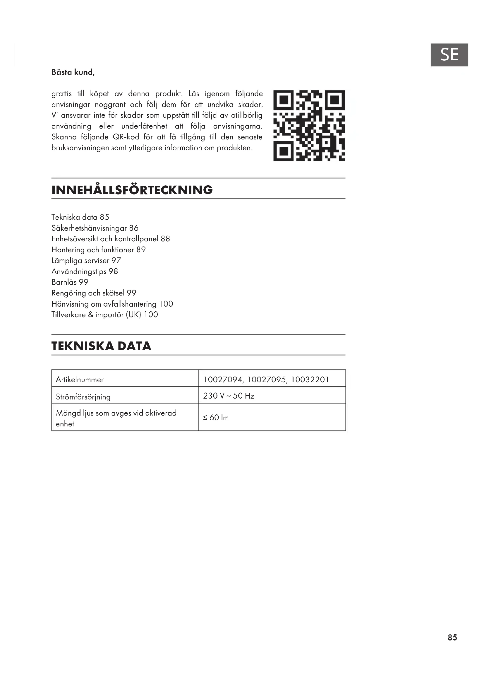 Tekniska data85 Säkerhetshänvisningar86 Enhetsöversikt och kontrollpanel88 Hantering och funktioner89 Lämpliga serviser97 Användningstips98 Barnlås99 Rengöring och skötsel99 Hänvisning om avfallshantering100 Tillverkare & importör (UK)100 TEKNISKA DATA Artikelnummer 10027094, 10027095, 10032201 Strömförsörjning 230 V ~ 50 Hz Mängd ljus som avges vid aktiverad enhet ≤ 60 lm86