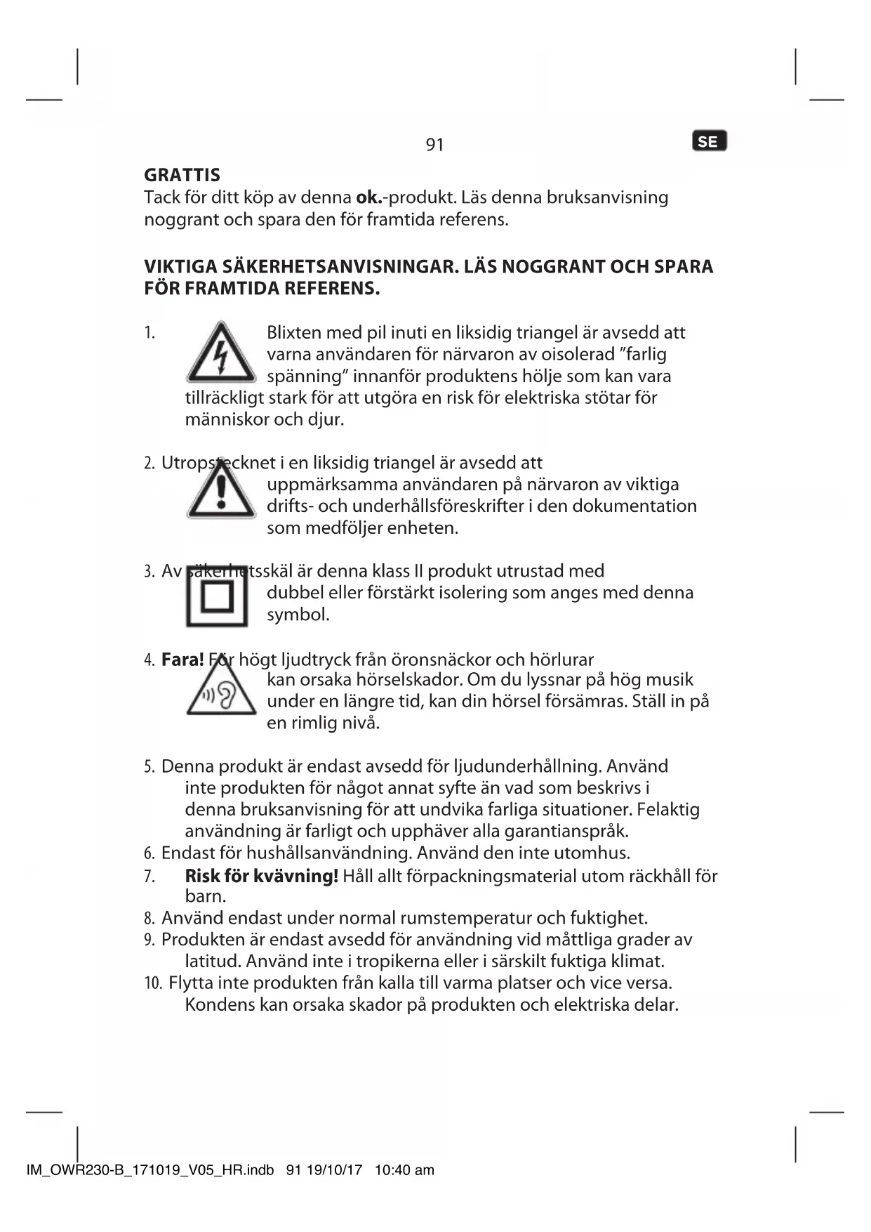 J. DC -ingång K. Hörlursuttag L. Ljudingång AUX IN M. Strömadapter N. Högtalare INNAN FöRSTA ANVÄNDNING Ta försiktigt upp produkten och tillbehören ur originalförpackningen. Kontrollera leveransens innehåll, så att alla delar nns med och att delarna inte är skadade. Om leveransens innehåll är ofullständigt eller skadat bör du kontakta din återförsäljare omedelbart. IM_OWR230-B_171019_V05_HR.indb 95 19/10/17 10:40 am96