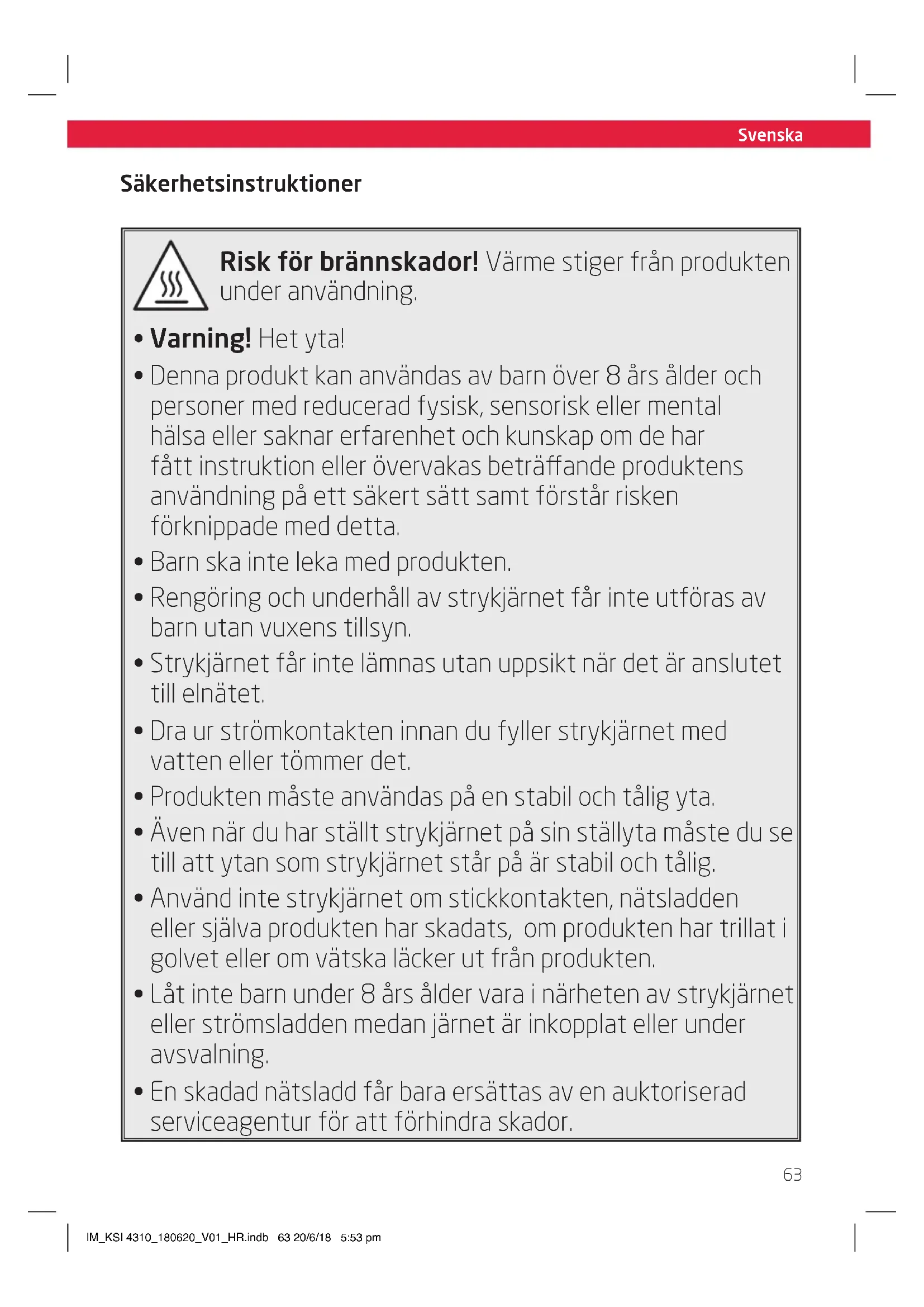 - En skadad nätsladd får bara ersättas av en auktoriserad serviceagentur för att förhindra skador. IM_KSI 4310_180620_V01_HR.indb 63 20/6/18 5:53 pmSvenska