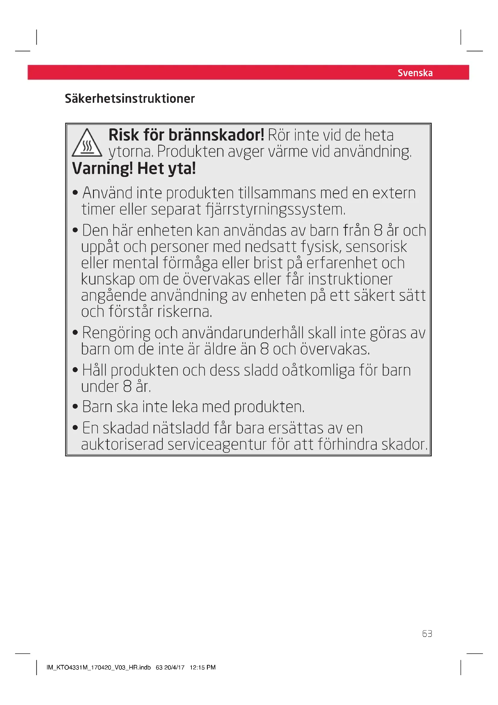 - Brandfara! Bröd kann brinna. Lämna inte brödrosten utan uppsikt under användning. Använd aldrig brödrosten i närheten av lättantändliga mateial, som t.ex. textilier, väggar osv. och täck inte över brödrosten. Se alltid till så att den står på ett säkert avstånd från lättantändliga material. IM_KTO4331M_170420_V03_HR.indb 64 20/4/17 12:15 PMSvenska