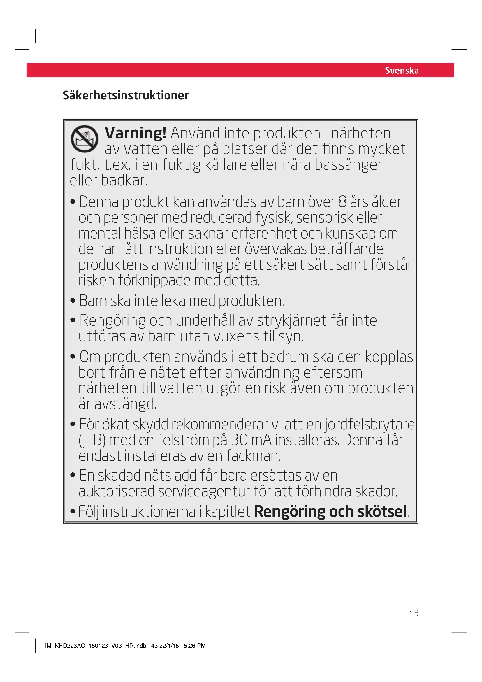 - Rengöring och underhäll av strykjärnet fär inte utföras av barnutan vuxens tillsyn.
