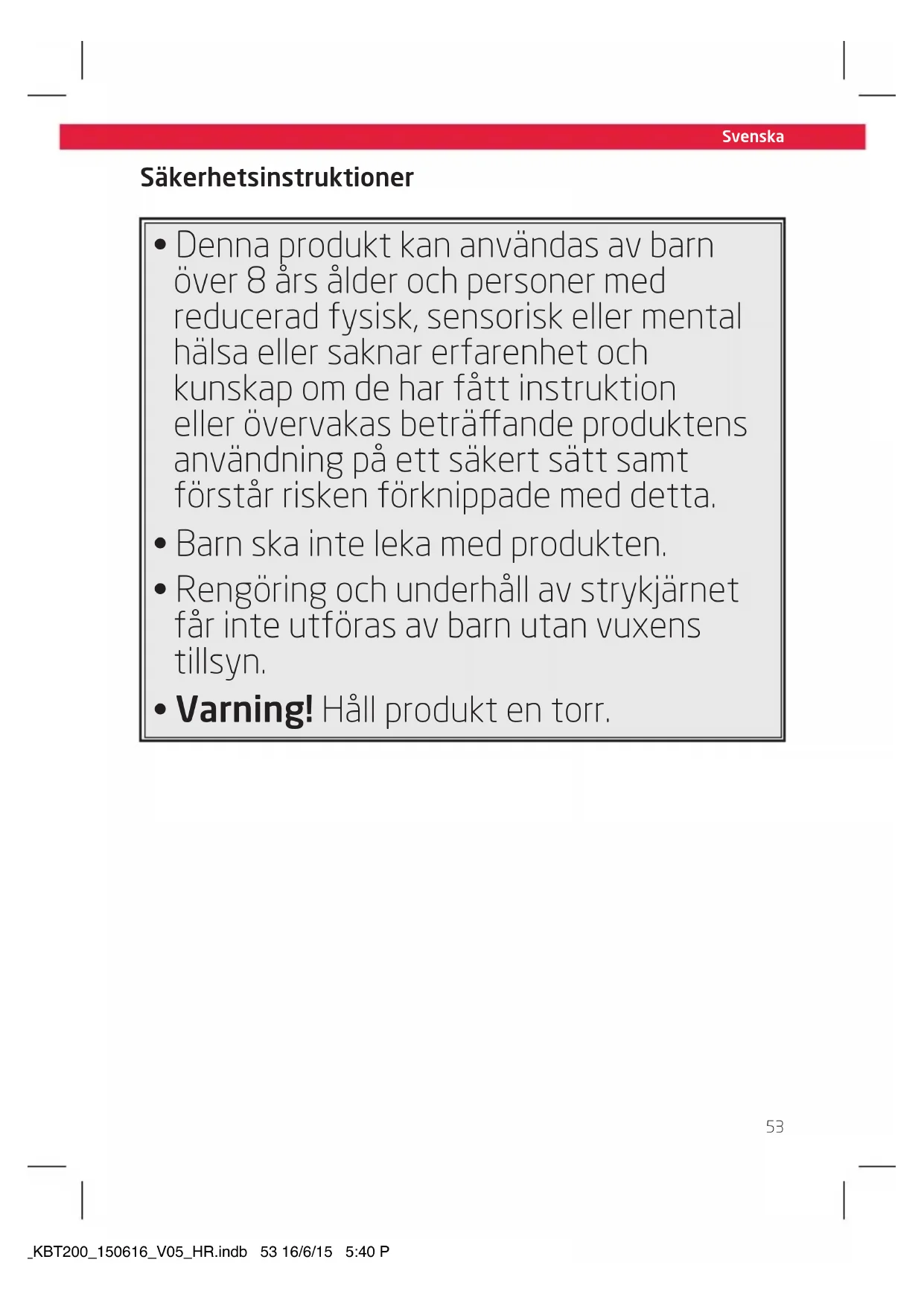 - Rengöring och underhäll av strykjärnet fär inte utföras av barnutan vuxens tillsyn.