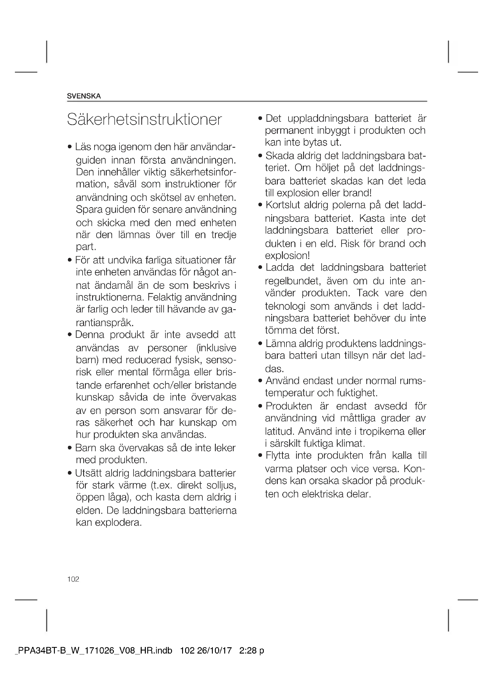 - Använd inte produkten längre och låt reparera den av en kvalificerad tekniker eller kontakta vår kund- tjänstavdelning om den uppvisar skador. Montera inte isär produkten och försök inte reparera den själv. IM_PPA34BT-B_W_171026_V08_HR.indb 103 26/10/17 2:28 pmSVENSKA