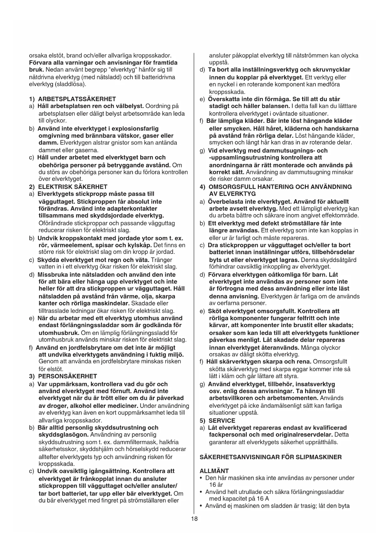 OBS! Läs noga igenom alla anvisningar. Fel som uppstår till följd av att anvisningarna nedan inte följts kan18 orsaka elstöt, brand och/eller allvarliga kroppsskador. Förvara alla varningar och anvisningar för framtida bruk. Nedan använt begrepp "elverktyg" hänför sig till nätdrivna elverktyg (med nätsladd) och till batteridrivna elverktyg (sladdlösa).
