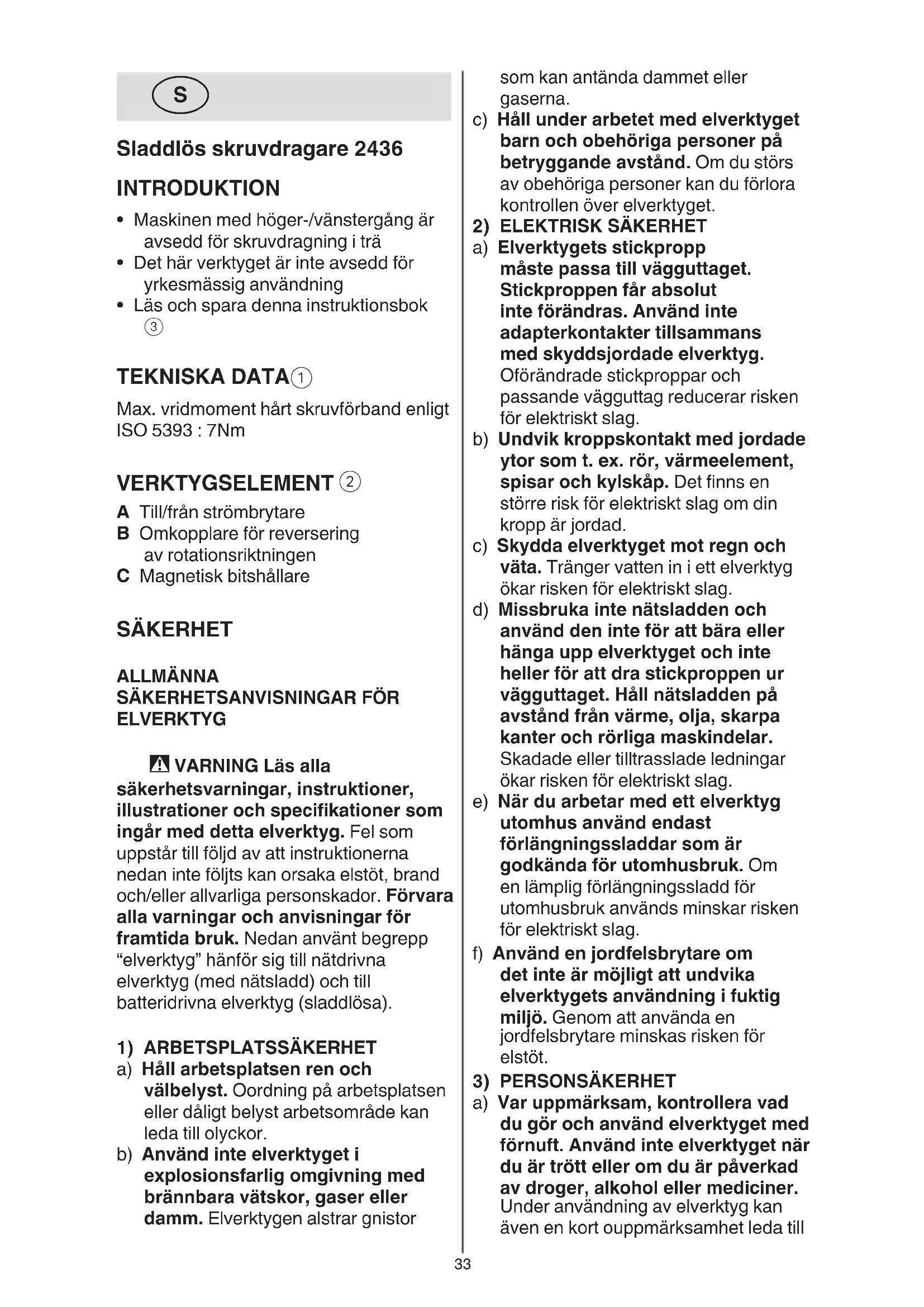A Till/från strömbrytare B Omkopplare för reversering av rotationsriktningen C Magnetisk bitshållare SÄKERHET ALLMÄNNA