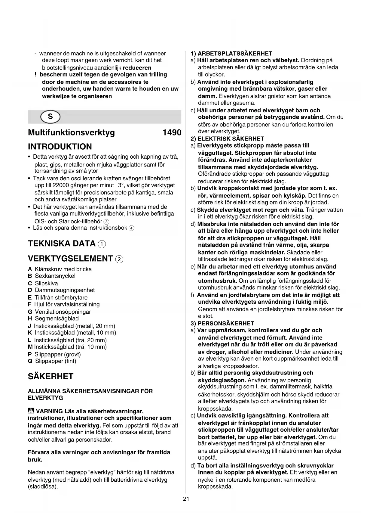 - Läs och spara denna instruktionsbok 4 TEKNISKA DATA 1 VERKTYGSELEMENT 2 A Klämskruv med bricka B Sexkantsnyckel C Slipskiva D Dammutsugningsenhet E Till/från strömbrytare F Hjul för varvtalsinställning G Ventilationsöppningar H Segmentsågblad J Instickssågblad (metall, 20 mm) K Instickssågblad (metall, 10 mm) L Instickssågblad (trä, 20 mm) M Instickssågblad (trä, 10 mm) P Slippapper (grovt) Q Slippapper (nt) SÄKERHET