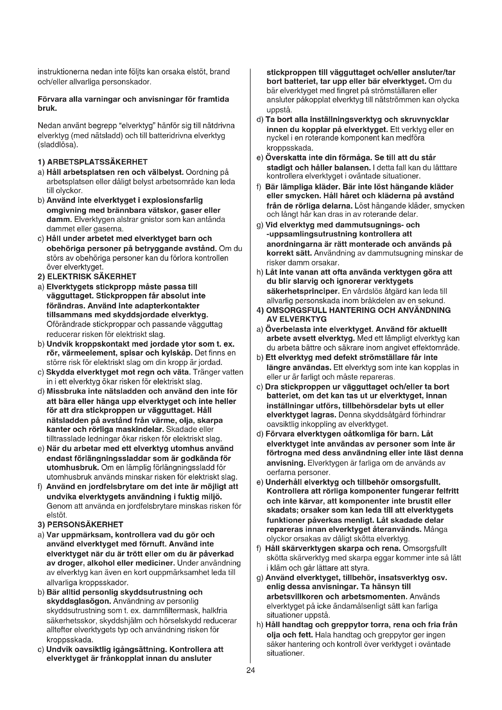 ELVERKTYG VARNING Läs alla säkerhetsvarningar, instruktioner, illustrationer och specifikationer som ingår med detta elverktyg. Fel som uppstår till följd av att24 instruktionerna nedan inte följts kan orsaka elstöt, brand och/eller allvarliga personskador. Förvara alla varningar och anvisningar för framtida bruk. Nedan använt begrepp “elverktyg” hänför sig till nätdrivna elverktyg (med nätsladd) och till batteridrivna elverktyg (sladdlösa).