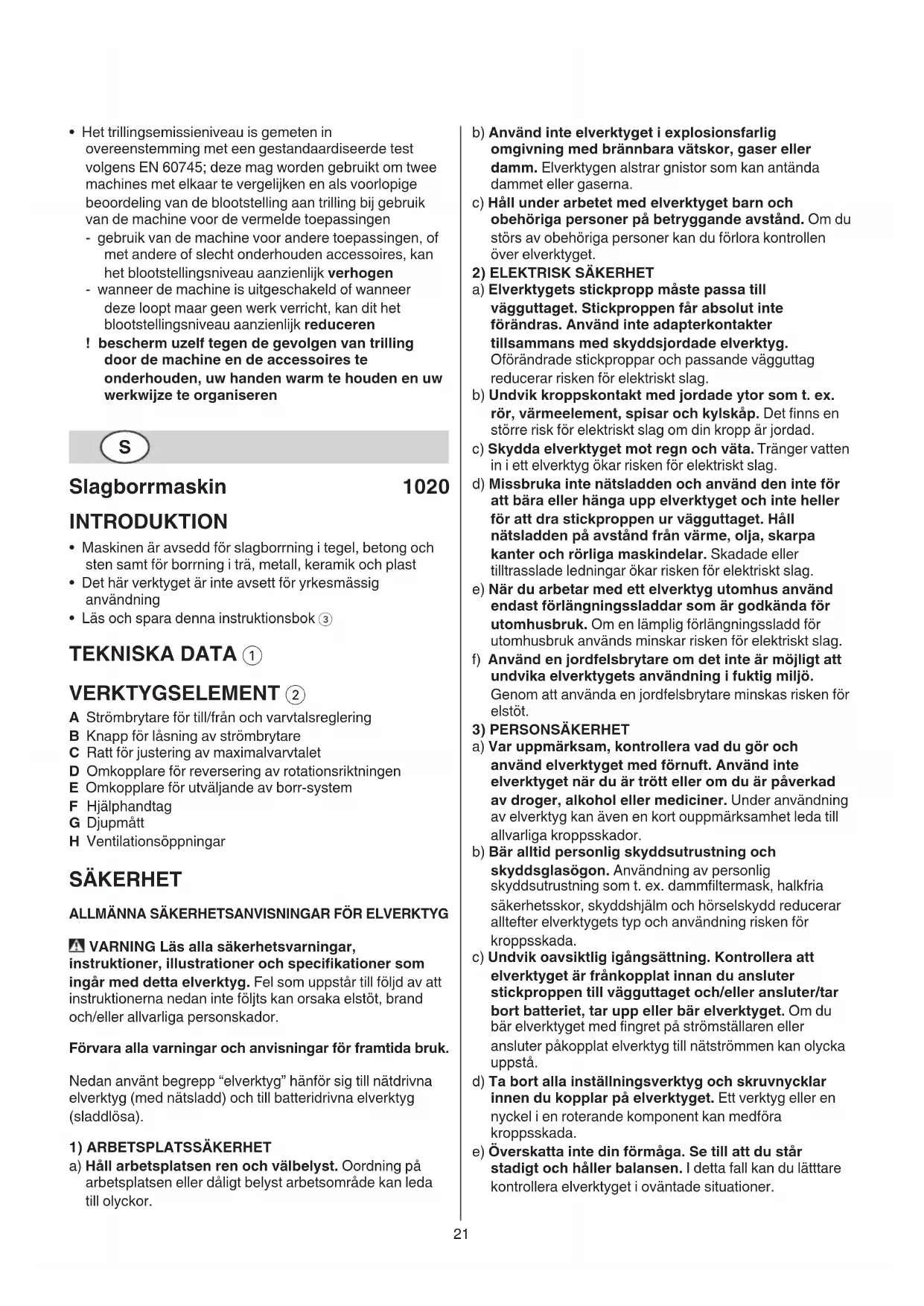 - Läs och spara denna instruktionsbok 3 TEKNISKA DATA 1 VERKTYGSELEMENT 2 A Strömbrytare för till/från och varvtalsreglering B Knapp för låsning av strömbrytare C Ratt för justering av maximalvarvtalet D Omkopplare för reversering av rotationsriktningen E Omkopplare för utväljande av borr-system F Hjälphandtag G Djupmått H Ventilationsöppningar SÄKERHET ALLMÄNNA SÄKERHETSANVISNINGAR FÖR ELVERKTYG VARNING Läs alla säkerhetsvarningar, instruktioner, illustrationer och specifikationer som ingår med detta elverktyg. Fel som uppstår till följd av att instruktionerna nedan inte följts kan orsaka elstöt, brand och/eller allvarliga personskador. Förvara alla varningar och anvisningar för framtida bruk. Nedan använt begrepp “elverktyg” hänför sig till nätdrivna elverktyg (med nätsladd) och till batteridrivna elverktyg (sladdlösa).
