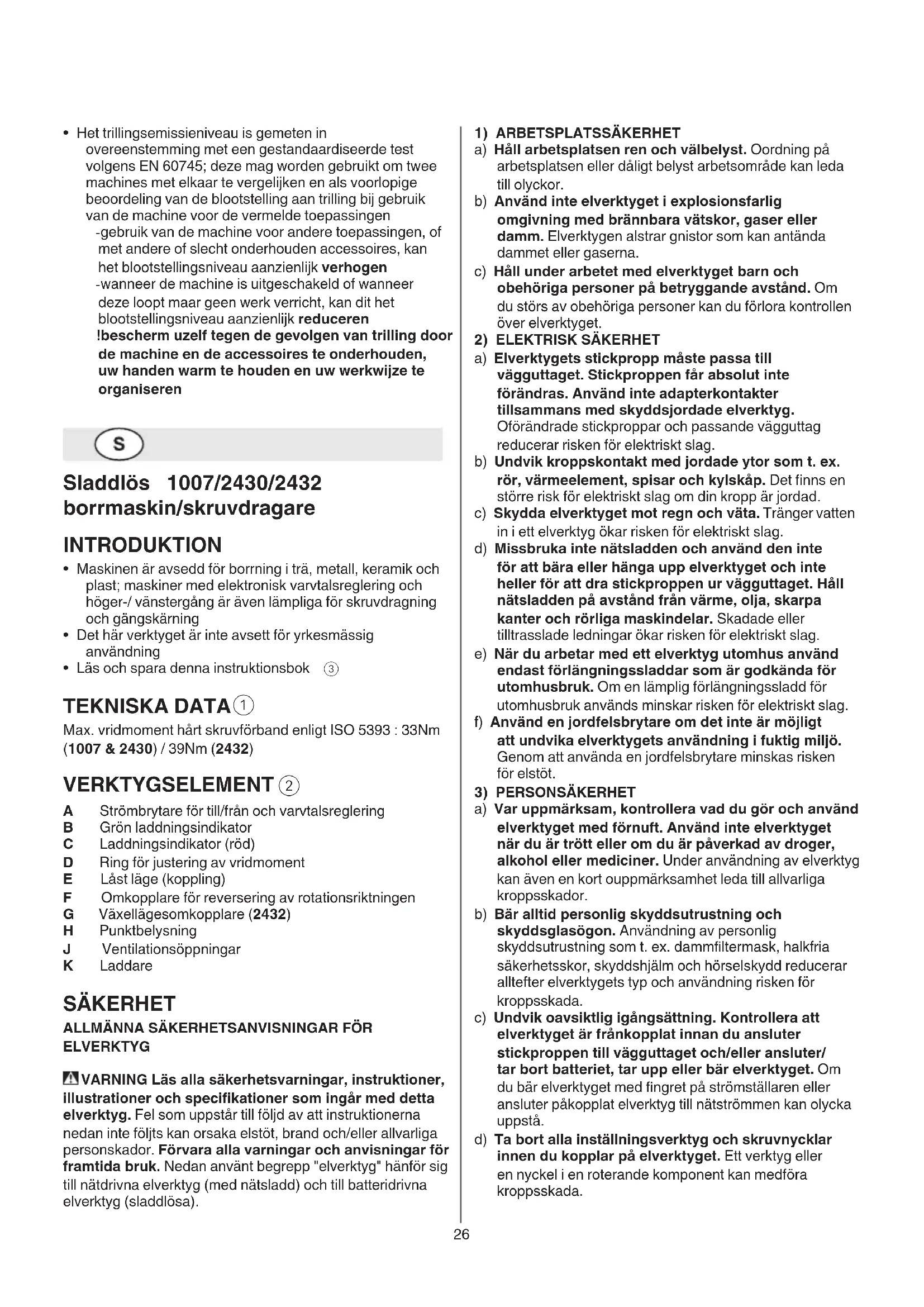 - Het trillingsemissieniveau is gemeten in overeenstemming met een gestandaardiseerde test volgens EN 60745; deze mag worden gebruikt om twee machines met elkaar te vergelijken en als voorlopige beoordeling van de blootstelling aan trilling bij gebruik van de machine voor de vermelde toepassingen - gebruik van de machine voor andere toepassingen, of met andere of slecht onderhouden accessoires, kan het blootstellingsniveau aanzienlijk verhogen - wanneer de machine is uitgeschakeld of wanneer deze loopt maar geen werk verricht, kan dit het blootstellingsniveau aanzienlijk reduceren ! bescherm uzelf tegen de gevolgen van trilling door de machine en de accessoires te onderhouden, uw handen warm te houden en uw werkwijze te organiseren Sladdlös 1007/2430/2432 borrmaskin/skruvdragare INTRODUKTION