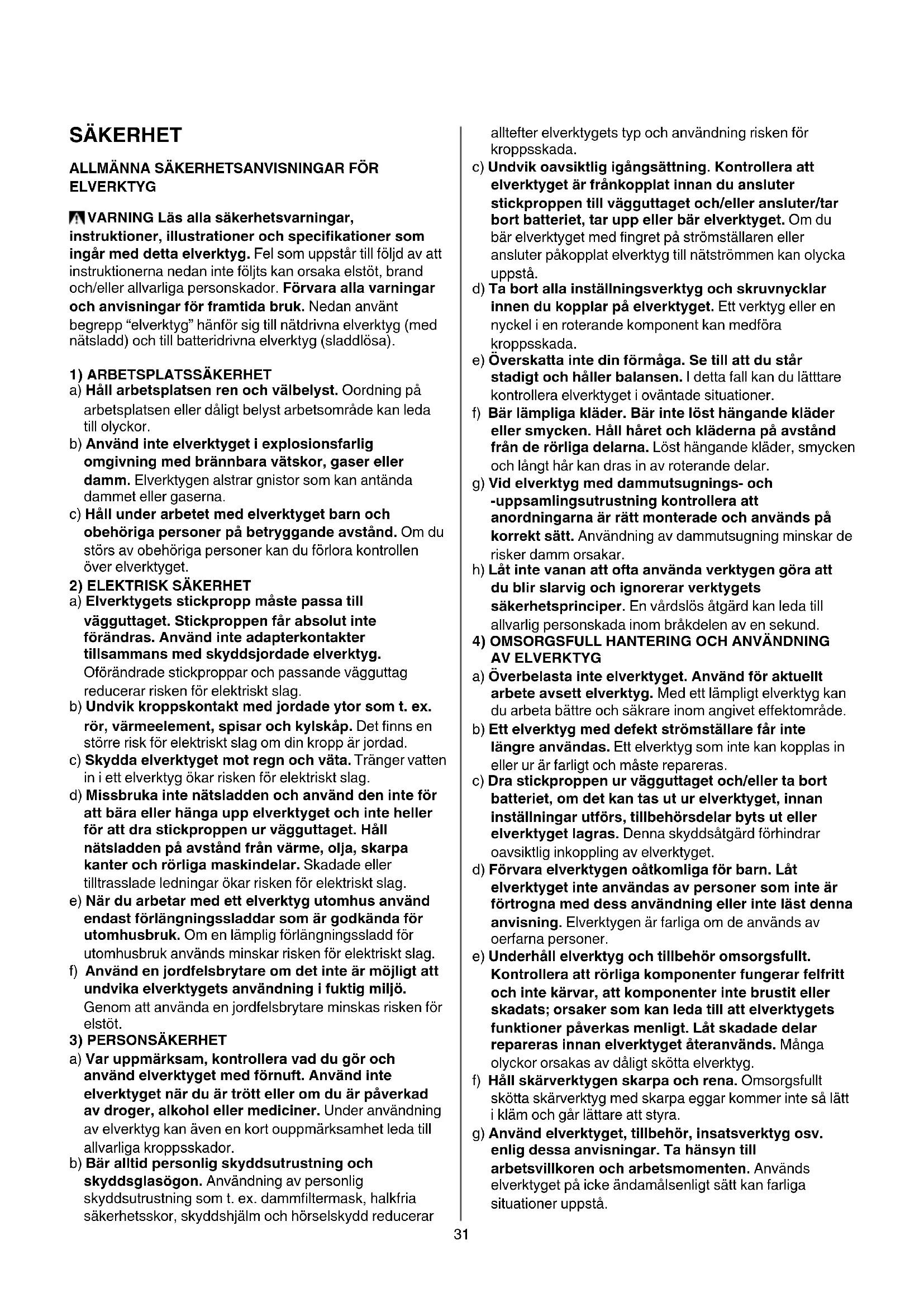 ELVERKTYG VARNING Läs alla säkerhetsvarningar, instruktioner, illustrationer och specifikationer som ingår med detta elverktyg. Fel som uppstår till följd av att instruktionerna nedan inte följts kan orsaka elstöt, brand och/eller allvarliga personskador. Förvara alla varningar och anvisningar för framtida bruk. Nedan använt begrepp “elverktyg” hänför sig till nätdrivna elverktyg (med nätsladd) och till batteridrivna elverktyg (sladdlösa).