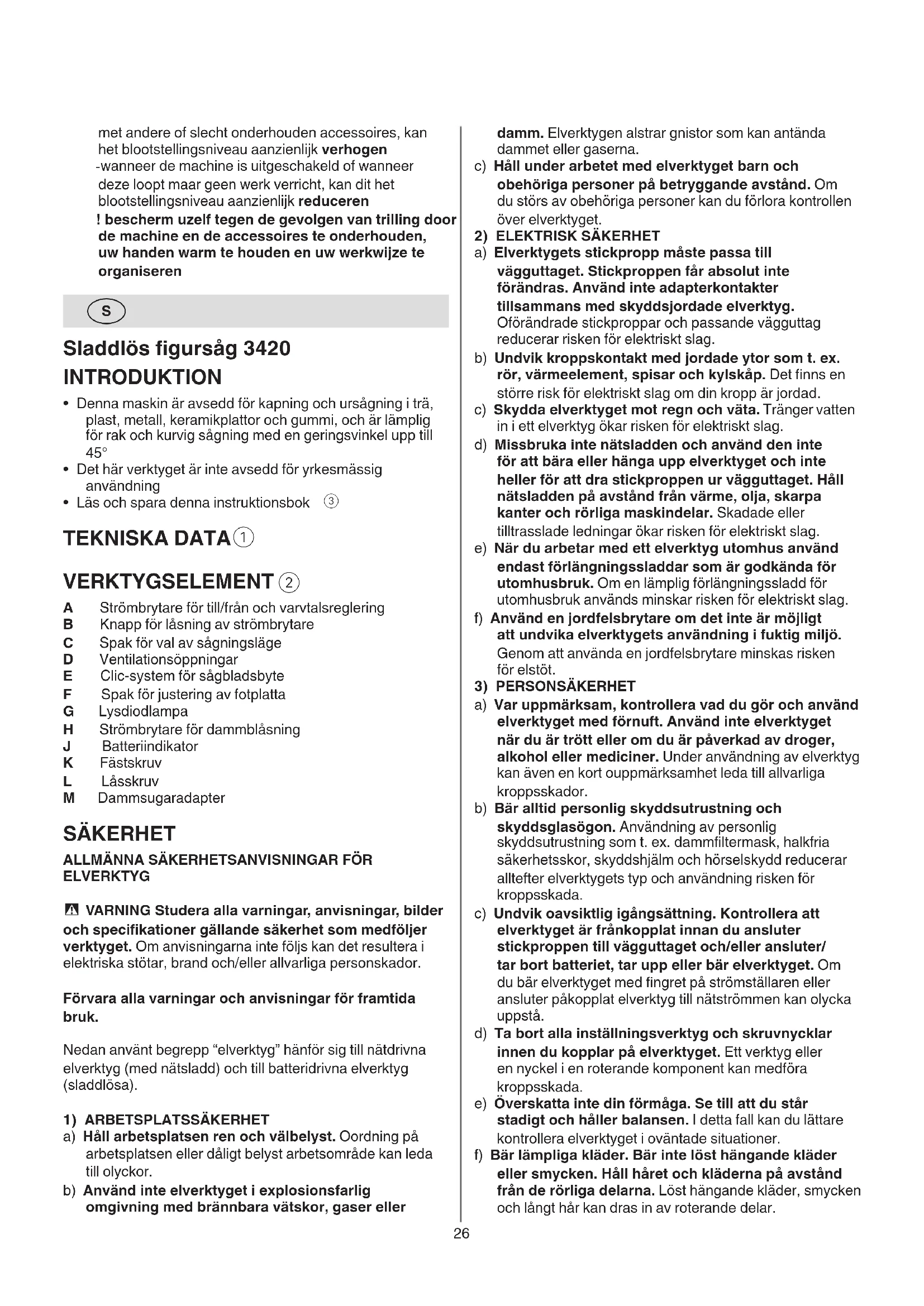 A Strömbrytare för till/från och varvtalsreglering B Knapp för låsning av strömbrytare C Spak för val av sågningsläge D Ventilationsöppningar E Clic-system för sågbladsbyte F Spak för justering av fotplatta G Lysdiodlampa H Strömbrytare för dammblåsning J Batteriindikator K Fästskruv L Låsskruv M Dammsugaradapter SÄKERHET
