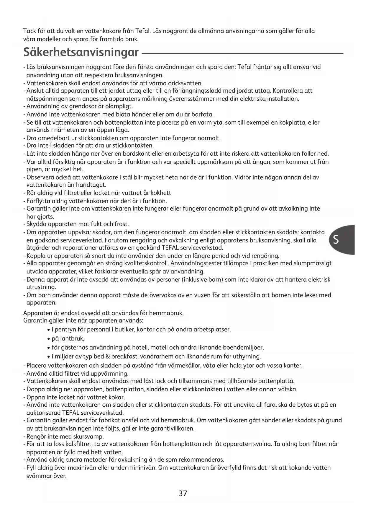 - i miljöer av typ bed & breakfast, vandrarhem och liknande rum för uthyrning. - Placera vattenkokaren och sladden på avstånd från värmekällor, våta eller hala ytor och vassa kanter. - Använd alltid filtret vid uppvärmning. - Vattenkokaren skall endast användas med låst lock och tillsammans med tillhörande bottenplatta. - Doppa aldrig ner apparaten, bottenplattan, sladden eller stickkontakten i vatten eller annan vätska. - Öppna inte locket när vattnet kokar. - Använd inte vattenkokaren om sladden eller stickkontakten skadats. För att undvika all fara, ska de bytas ut på en auktoriserad TEFAL serviceverkstad. - Garantin gäller endast för fabrikationsfel och vid hemmabruk. Om vattenkokaren gått sönder eller skadats på grund av att bruksanvisningen inte följts, gäller inte garantivillkoren. - Rengör inte med skursvamp. - För att ta loss kalkfiltret, ta av vattenkokaren från bottenplattan och låt apparaten svalna. Ta aldrig bort filtret när apparaten är fylld med hett vatten. - Använd aldrig andra metoder för avkalkning än de som rekommenderas. - Fyll aldrig över maxinivån eller under mininivån. Om vattenkokaren är överfylld finns det risk att kokande vatten svämmar över.