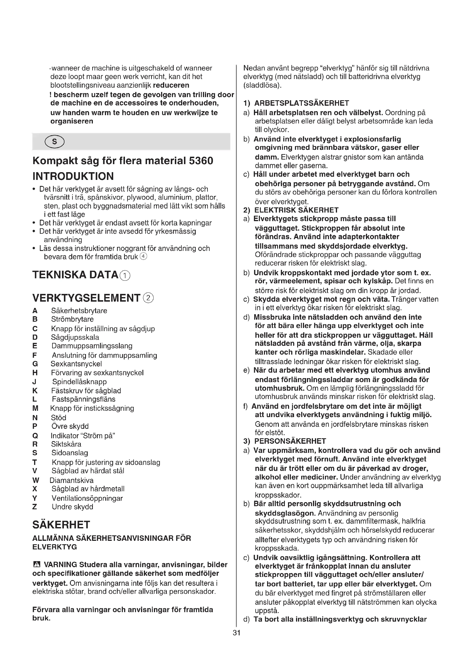 A Säkerhetsbrytare B Strömbrytare C Knapp för inställning av sågdjup D Sågdjupsskala E Dammuppsamlingsslang F Anslutning för dammuppsamling G Sexkantsnyckel H Förvaring av sexkantsnyckel J Spindellåsknapp K Fästskruv för sågblad L Fastspänningsäns M Knapp för instickssågning N Stöd P Övre skydd Q Indikator “Ström på” R Siktskåra S Sidoanslag T Knapp för justering av sidoanslag V Sågblad av härdat stål W Diamantskiva X Sågblad av hårdmetall Y Ventilationsöppningar Z Undre skydd SÄKERHET