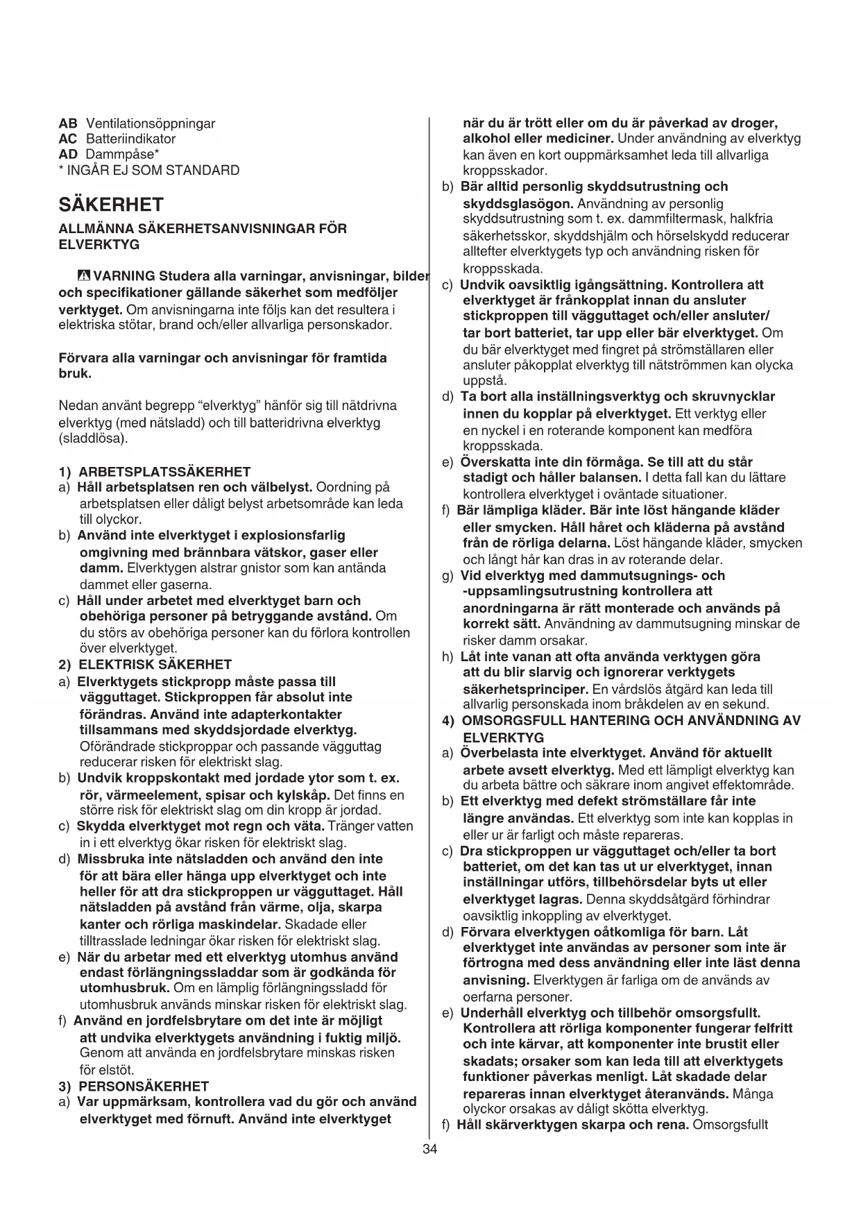 ELVERKTYG a) Överbelasta inte elverktyget. Använd för aktuellt arbete avsett elverktyg. Med ett lämpligt elverktyg kan du arbeta bättre och säkrare inom angivet eektområde. b) Ett elverktyg med defekt strömställare får inte längre användas. Ett elverktyg som inte kan kopplas in eller ur är farligt och måste repareras. c) Dra stickproppen ur vägguttaget och/eller ta bort batteriet, om det kan tas ut ur elverktyget, innan inställningar utförs, tillbehörsdelar byts ut eller elverktyget lagras. Denna skyddsåtgärd förhindrar oavsiktlig inkoppling av elverktyget. d) Förvara elverktygen oåtkomliga för barn. Låt elverktyget inte användas av personer som inte är förtrogna med dess användning eller inte läst denna anvisning. Elverktygen är farliga om de används av oerfarna personer. e) Underhåll elverktyg och tillbehör omsorgsfullt. Kontrollera att rörliga komponenter fungerar felfritt och inte kärvar, att komponenter inte brustit eller skadats; orsaker som kan leda till att elverktygets funktioner påverkas menligt. Låt skadade delar repareras innan elverktyget återanvänds. Många olyckor orsakas av dåligt skötta elverktyg. f) Håll skärverktygen skarpa och rena. Omsorgsfullt AB Ventilationsöppningar AC Batteriindikator AD Dammpåse*