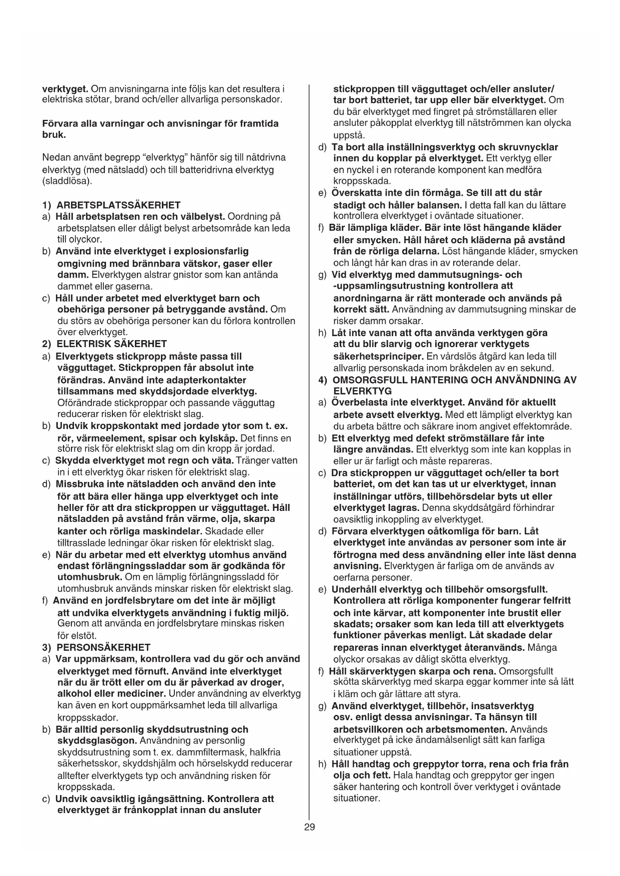 a) Var uppmärksam, kontrollera vad du gör och använd elverktyget med förnuft. Använd inte elverktyget när du är trött eller om du är påverkad av droger, alkohol eller mediciner. Under användning av elverktyg kan även en kort ouppmärksamhet leda till allvarliga kroppsskador. b) Bär alltid personlig skyddsutrustning och skyddsglasögon. Användning av personlig skyddsutrustning som t. ex. dammltermask, halkfria säkerhetsskor, skyddshjälm och hörselskydd reducerar alltefter elverktygets typ och användning risken för kroppsskada. c) Undvik oavsiktlig igångsättning. Kontrollera att elverktyget är frånkopplat innan du ansluter30