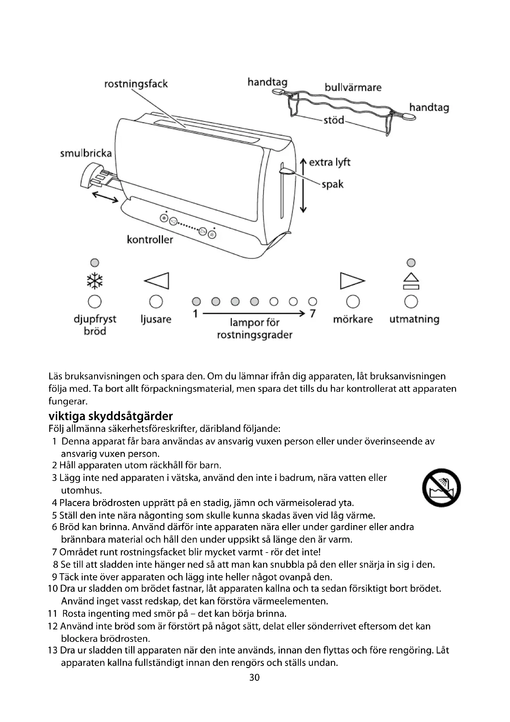 8 Risteindikatorerne tænder/slukker, alt efter hvor brunt brødet skal være. 9 Jo flere tændte risteindikatorer, jo mørkere bliver brødet. 10 Læg brød ned i toasterens brødåbning (maks. tykkelse 28 mm). 11 Tryk stangen ned til bunds. , Det er ikke muligt at låse stangen i position medmindre brødristeren er koblet til strømforsyningen. 12 Risteindikatorerne tæller ned: a) indikatoren til højre blinker, og de resterende indikatorer lyser b) indikatoren til højre slukkes og indikatoren til venstre for den blinker c) indikatorerne hhv. lyser, blinker og slukkes, indtil alle er slukket d) når alle indikatorer er slukket, skubbes brødet op. skub op $ 13 Hvis du ønsker at afbryde brødristeren halvvejs, skal du trykke på $. 14 Knappen $ lyser, brødet skubbes op, og $ slukker igen.28 ekstra løft 15 Efter ristningen af små stykker (bagels, teboller) er det muligt at stangen skal løftes lidt mere op, for at kunne erne dem nemmere. frosset brød f 16 Indstil risteindikatoren på det ønskede niveau, læg det frosne brød i risteren, tryk stangen ned og tryk på f. 17 f-indikatoren tænder, og ristetiden ændres automatisk, så brødet får samme bruningsgrad, som frisk brød normalt får. bollerister , Bolleristeren må udelukkende anvendes ved ristningsgrad 1. 18 Bolleristeren må ikke bruges til opvarmning af boller der er nedfrosne, smurt, overtrukket, dækket med is eller fyldte. 19 Sæt bolleristeren fast på toasteren med benene ned i toasteren. 20 Bollerne placeres oven på bolleristeren. 21 Indstil ristningsgraden til 1 og træk stangen ned. 22 Når stangen skubbes op ernes de varme boller 23 Undlad at røre ved bolleristerens ledninger – de er varme. 24 Husk at erne bolleristeren, før du anvender brødristeren igen på normal måde. genopvarmning af brød 25 Anvend den laveste indstilling. Kun brød uden smør eller pålæg må genopvarmes. gode råd og tips 26 Når du rister mere end én skive brød ad gangen, er det en fordel, hvis skiverne har samme størrelse og tykkelse og er lige friske. 27 Daggammelt brød indeholder mindre vand end friskt brød, og derfor bliver det sprødere, når det ristes. 28 Daggammelt eller tyndt brød ristes hurtigere end friskt eller tykt brød. Derfor skal du anvende en lavere indstilling. 29 Sødt brød (f.eks. frugtboller) bliver meget hurtigere brunt end almindeligt brød, så derfor skal du anvende en lavere indstilling. pleje og vedligeholdelse 30 Tag brødristeren ud af stikkontakten, og lad den køle af. 31 Tør apparatets yderside af med en fugtig klud. Anvend om nødvendigt lidt opvaskemiddel. 32 Tag krummebakken ud, og tøm den. Tør den af med en fugtig klud, lad den tørre, og sæt den i brødristeren igen. 33 Undlad at anvende brødristeren, hvis krummebakken ikke er monteret og lukket. 34 Nedsænk ikke apparatet i vand eller andre væsker. 35 Undlad at anvende skrappe eller slibende rengøringsmidler eller opløsningsmidler til rengøring af apparatet. symbolet med en affaldsspand Elektriske og elektroniske apparater, der er mærket med dette symbol, kan indeholde farlige stoffer, og må ikke bortskaffes med husholdningsaffald, men skal afleveres på en dertil udpeget lokal genbrugsstation for at undgå skade på miljø og menneskers sundhed.2930 Läs bruksanvisningen och spara den. Om du lämnar ifrån dig apparaten, låt bruksanvisningen följa med. Ta bort allt förpackningsmaterial, men spara det tills du har kontrollerat att apparaten fungerar. viktiga skyddsåtgärder Följ allmänna säkerhetsföreskrifter, däribland följande: 1 Denna apparat får bara användas av ansvarig vuxen person eller under överinseende av ansvarig vuxen person. 2 Håll apparaten utom räckhåll för barn. 3 Lägg inte ned apparaten i vätska, använd den inte i badrum, nära vatten eller utomhus. 4 Placera brödrosten upprätt på en stadig, jämn och värmeisolerad yta. 5 Ställ den inte nära någonting som skulle kunna skadas även vid låg värme. 6 Bröd kan brinna. Använd därför inte apparaten nära eller under gardiner eller andra brännbara material och håll den under uppsikt så länge den är varm. 7 Området runt rostningsfacket blir mycket varmt - rör det inte! 8 Se till att sladden inte hänger ned så att man kan snubbla på den eller snärja in sig i den. 9 Täck inte över apparaten och lägg inte heller något ovanpå den. 10 Dra ur sladden om brödet fastnar, låt apparaten kallna och ta sedan försiktigt bort brödet. Använd inget vasst redskap, det kan förstöra värmeelementen. 11 Rosta ingenting med smör på – det kan börja brinna. 12 Använd inte bröd som är förstört på något sätt, delat eller sönderrivet eftersom det kan blockera brödrosten. 13 Dra ur sladden till apparaten när den inte används, innan den flyttas och före rengöring. Låt apparaten kallna fullständigt innan den rengörs och ställs undan.31 bruksanvisning 14 Rensa ofta bort smulor från brödrosten, annars ansamlas smulor i den – det är ohygieniskt och kan orsaka brand. 15 Använd inte brödrosten om inte smulbrickan är på plats och stängd. 16 Håll apparat och sladd borta från värmeplattor, spisplattor eller öppen låga. 17 Använd inte apparaten för några andra ändamål än sådana som beskrivs i denna bruksanvisning. 18 Apparaten får inte användas med hjälp av en extern timer eller något ärrkontrollsystem. 19 Använd inte apparaten om den är skadad eller fungerar dåligt. 20 Om sladden är skadad måste den ersättas av tillverkaren, serviceombud eller någon med liknande kompetens för att undvika skaderisker. endast för hushållsbruk touchkontroller
