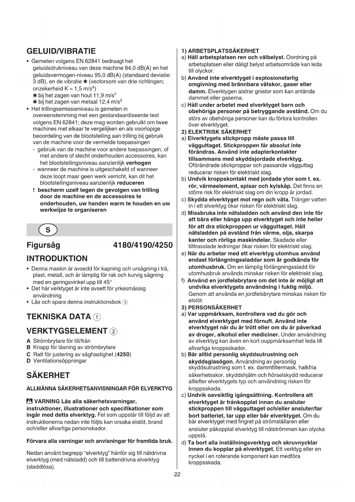 - Läs och spara denna instruktionsbok 3 TEKNISKA DATA 1 VERKTYGSELEMENT 2 A Strömbrytare för till/från B Knapp för låsning av strömbrytare C Ratt för justering av såghastighet (4250) D Ventilationsöppningar SÄKERHET ALLMÄNNA SÄKERHETSANVISNINGAR FÖR ELVERKTYG VARNING Läs alla säkerhetsvarningar, instruktioner, illustrationer och specifikationer som ingår med detta elverktyg. Fel som uppstår till följd av att instruktionerna nedan inte följts kan orsaka elstöt, brand och/eller allvarliga personskador. Förvara alla varningar och anvisningar för framtida bruk. Nedan använt begrepp “elverktyg” hänför sig till nätdrivna elverktyg (med nätsladd) och till batteridrivna elverktyg (sladdlösa).