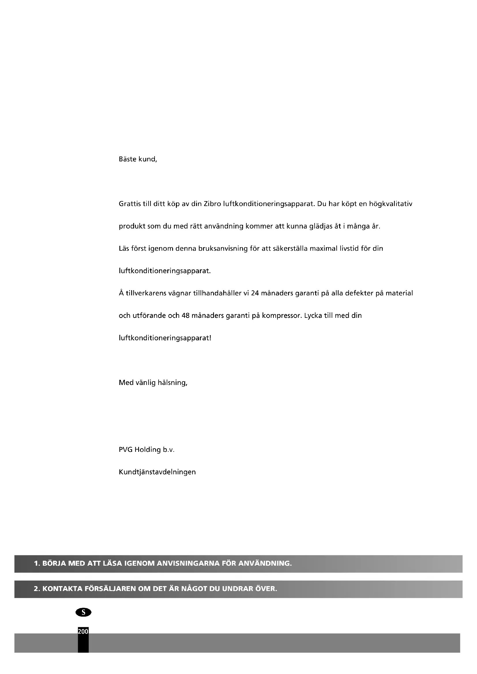 Internet: Om u nog beter van dienst te zijn kunt u de meest recente versie van de gebruikers-, installatie- en/of serv- ice handleiding downloaden op www.zibro.com. man_S(C)36xx.qxd:man_S18xx 15-03-13 13:46 Page 199Bäste kund, Grattis till ditt köp av din Zibro luftkonditioneringsapparat. Du har köpt en högkvalitativ produkt som du med rätt användning kommer att kunna glädjas åt i många år. Läs först igenom denna bruksanvisning för att säkerställa maximal livstid för din luftkonditioneringsapparat. Å tillverkarens vägnar tillhandahåller vi 24 månaders garanti på alla defekter på material och utförande och 48 månaders garanti på kompressor. Lycka till med din luftkonditioneringsapparat! Med vänlig hälsning, PVG Holding b.v. Kundtjänstavdelningen