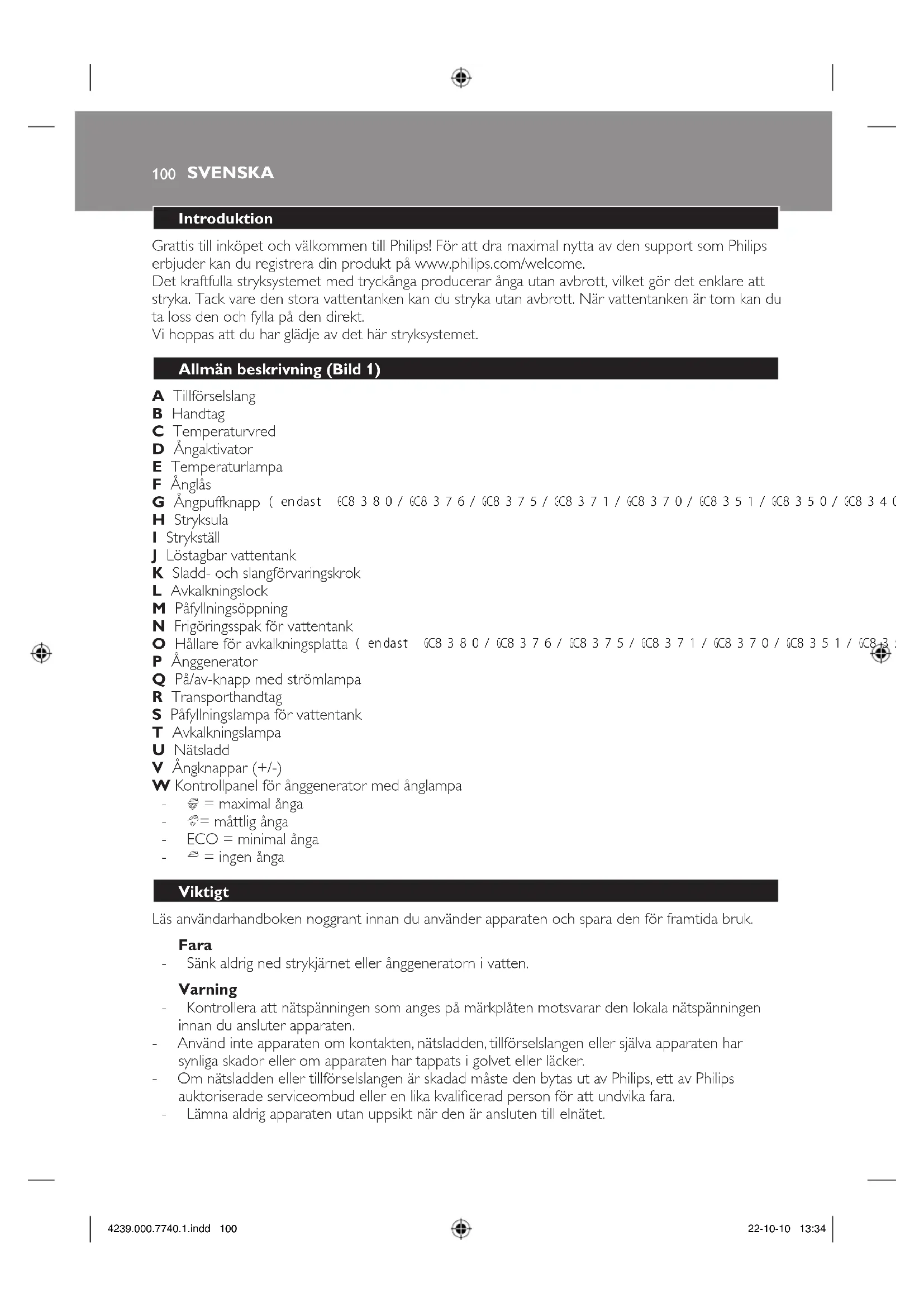 Grattis till inköpet och välkommen till Philips! För att dra maximal nytta av den support som Philips erbjuder kan du registrera din produkt på www.philips.com/welcome. Det kraftfulla stryksystemet med tryckånga producerar ånga utan avbrott, vilket gör det enklare att stryka. Tack vare den stora vattentanken kan du stryka utan avbrott. När vattentanken är tom kan du ta loss den och fylla på den direkt. Vi hoppas att du har glädje av det här stryksystemet.