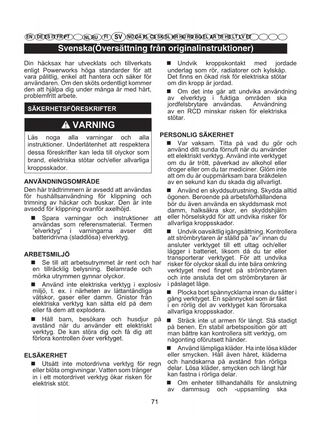 INNAN DU ANVÄNDER VERKTYGET. Läs noggrant alla säkerhetsföreskrifter. Bekanta dig med verktyget och ta reda på hur det fungerar. Använd inte verktyget om du är trött eller sjuk, påverkad av alkohol eller droger eller om du tar mediciner. Kontrollera verktygets skick innan du använder det. Byt ut skadade delar. Kontrollera att batterivätska inte läcker ut. Kontrollera att alla fästen och skydd är monterade och stadigt åtdragna. Byt ut blad eller andra delar som är spruckna, kantstötta eller skadade. Kontrollera att bladet är rätt monterat och stadigt fäst. På detta sätt kan du undvika risker för kroppsskador både för användaren och andra personer samt risker för skador på verktyget. Använd lämpligt verktyg. Använd häckkli- pparen endast för arbeten till vilka den är anpassad. Använd inte häckklipparen om det inte går att sätta i gång den och stoppa den med strömbrytaren. Ett verktyg som inte kan sättas på och stängas av korrekt är farligt och måste absolut repareras. Rengör arbetsområdet innan du använder verktyget. Ta bort sladdar, elledningar, snören och andra föremål som kan fastna i bladet. Barn, besökare och husdjur måste hållas på avstånd från arbetsområdet. Håll barn, besökare och husdjur på minst 15 m avstånd, för olika föremål kunde slungas ut under arbetet. Vi rekommenderar att även besökare använder ögonskydd. Om en person kommer i närheten medan du arbetar bör du omedelbart stanna häckklipparen. Använd inte elektriska verktyg i explosiv miljö, t. ex. i närheten av lättantändliga vätskor, gaser eller damm. Gnistor från elektriska verktyg kan sätta eld på dem eller få dem att explodera. För att undvika risker för elstöt bör du inte utsätta laddaren för regn eller fukt. Använd inte häckklipparen om du har våta händer. Låt inte barn eller vuxna som inte utbildats för det använda häcksaxen. För att minska riskerna för allvarliga ögonskador bör du alltid använda skyddsglasögon då du arbetar med häckklipparen. Använd en hel ansiktsmask eller en mask som skyddar mot damm, om arbetet alstrar mycket damm. Använd lämpliga kläder. Använd inte vida kläder eller smycken som kan fångas upp av maskindelar i rörelse. Vi rekommenderar användning av gummihandskar och halksäkra skor vid arbete utomhus. Om du har långt hår bör du se till att binda upp och täcka över det för att hindra att det fastnar i rörliga delar. 73Svenska(Översättning från originalinstruktioner)