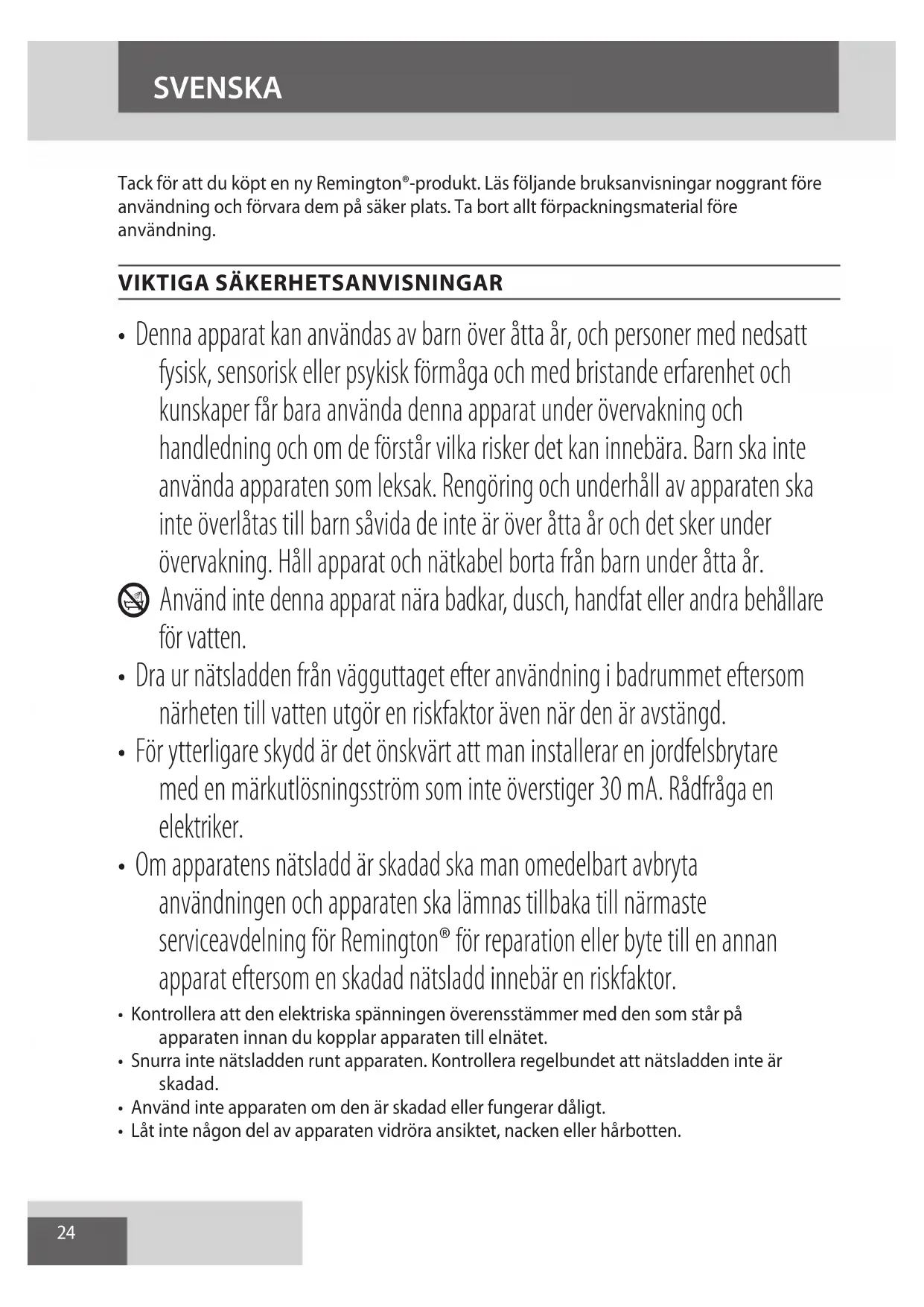 AE24 SVENSKA Tack för att du köpt en ny Remington®-produkt. Läs följande bruksanvisningar noggrant före användning och förvara dem på säker plats. Ta bort allt förpackningsmaterial före användning.