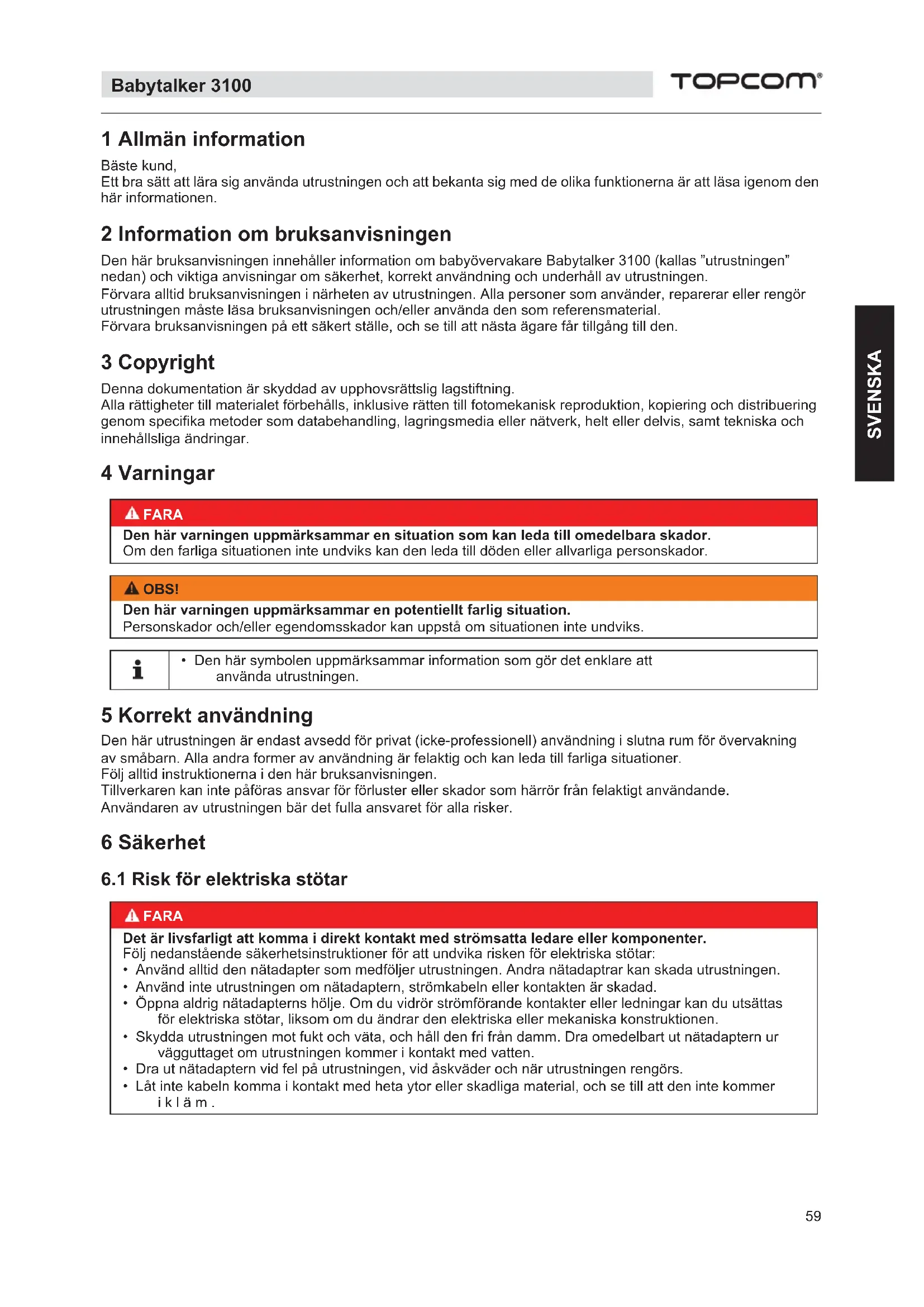 Babytalker 3100 SVENSKA 1 Allmän information Bäste kund, Ett bra sätt att lära sig använda utrustningen och att bekanta sig med de olika funktionerna är att läsa igenom den här informationen. 2 Information om bruksanvisningen Den här bruksanvisningen innehåller information om babyövervakare Babytalker 3100 (kallas ”utrustningen” nedan) och viktiga anvisningar om säkerhet, korrekt användning och underhåll av utrustningen. Förvara alltid bruksanvisningen i närheten av utrustningen. Alla personer som använder, reparerar eller rengör utrustningen måste läsa bruksanvisningen och/eller använda den som referensmaterial. Förvara bruksanvisningen på ett säkert ställe, och se till att nästa ägare får tillgång till den. 3 Copyright Denna dokumentation är skyddad av upphovsrättslig lagstiftning. Alla rättigheter till materialet förbehålls, inklusive rätten till fotomekanisk reproduktion, kopiering och distribuering genom specifika metoder som databehandling, lagringsmedia eller nätverk, helt eller delvis, samt tekniska och innehållsliga ändringar. 4 Varningar 5 Korrekt användning Den här utrustningen är endast avsedd för privat (icke-professionell) användning i slutna rum för övervakning av småbarn. Alla andra former av användning är felaktig och kan leda till farliga situationer. Följ alltid instruktionerna i den här bruksanvisningen. Tillverkaren kan inte påföras ansvar för förluster eller skador som härrör från felaktigt användande. Användaren av utrustningen bär det fulla ansvaret för alla risker. 6 Säkerhet