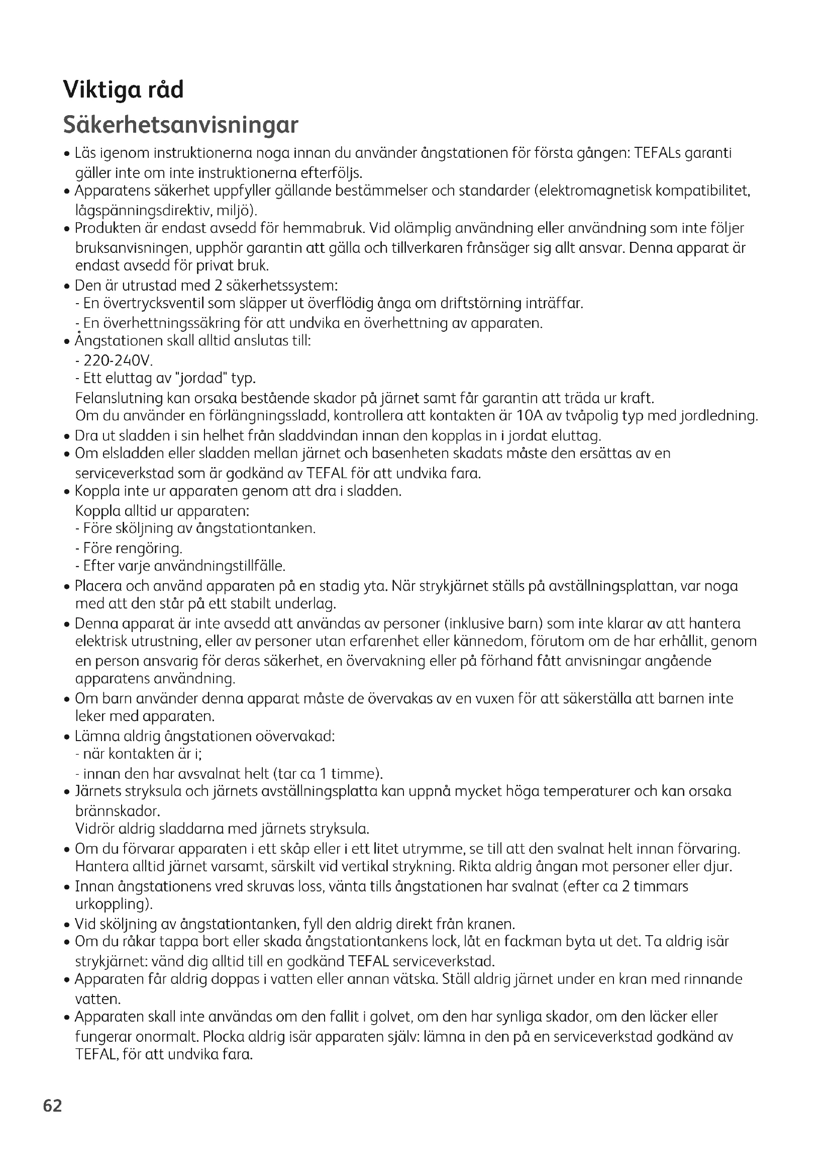 - Läs igenom instruktionerna noga innan du använder ångstationen för första gången: TEFALs garanti gäller inte om inte instruktionerna efterföljs.