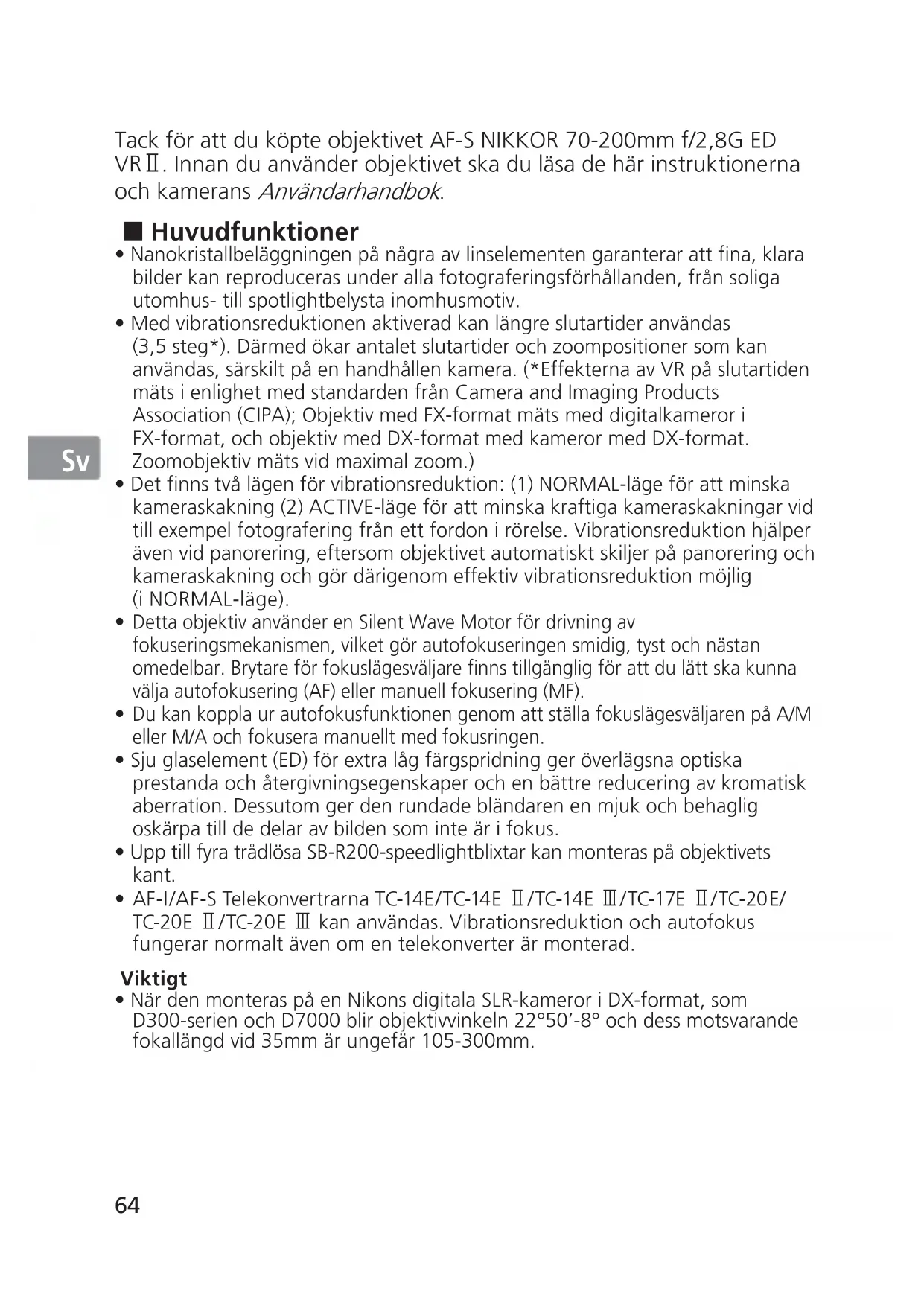 Tack för att du köpte objektivet AF-S NIKKOR 70-200mm f/2,8G ED VRⅡ. Innan du använder objektivet ska du läsa de här instruktionerna och kamerans Användarhandbok