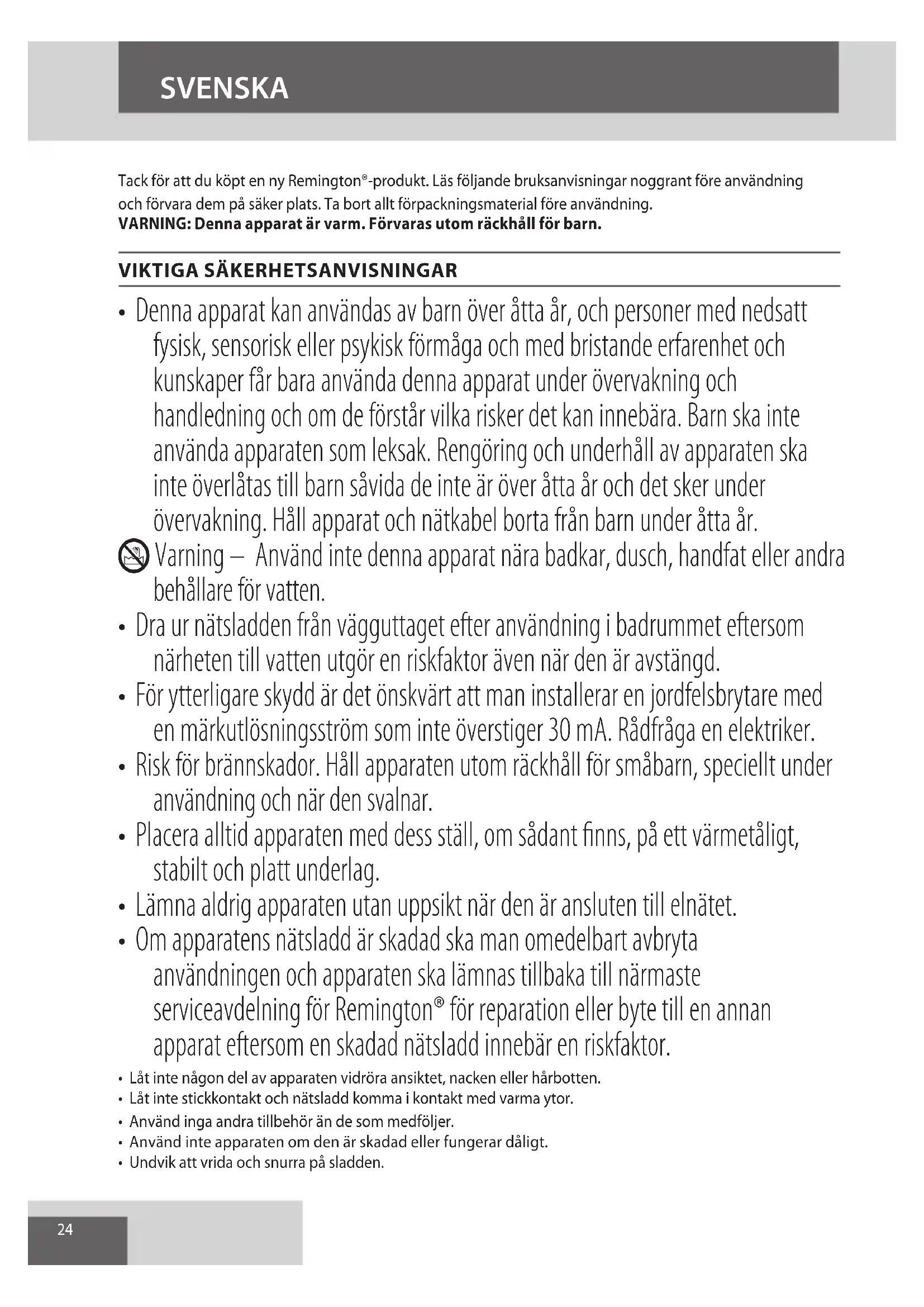 AE24 Tack för att du köpt en ny Remington®-produkt. Läs följande bruksanvisningar noggrant före användning och förvara dem på säker plats. Ta bort allt förpackningsmaterial före användning. VARNING: Denna apparat är varm. Förvaras utom räckhåll för barn.