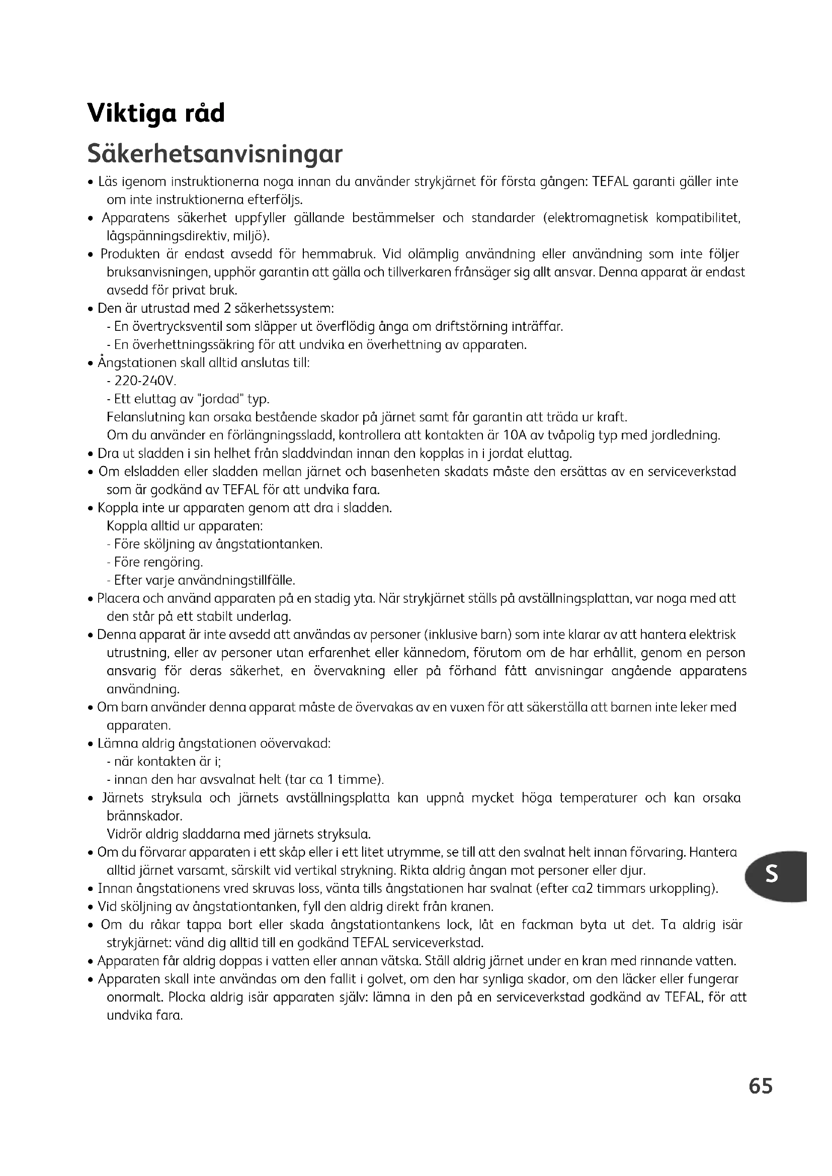 - Läs igenom instruktionerna noga innan du använder strykjärnet för första gången: TEFAL garanti gäller inte om inte instruktionerna efterföljs.