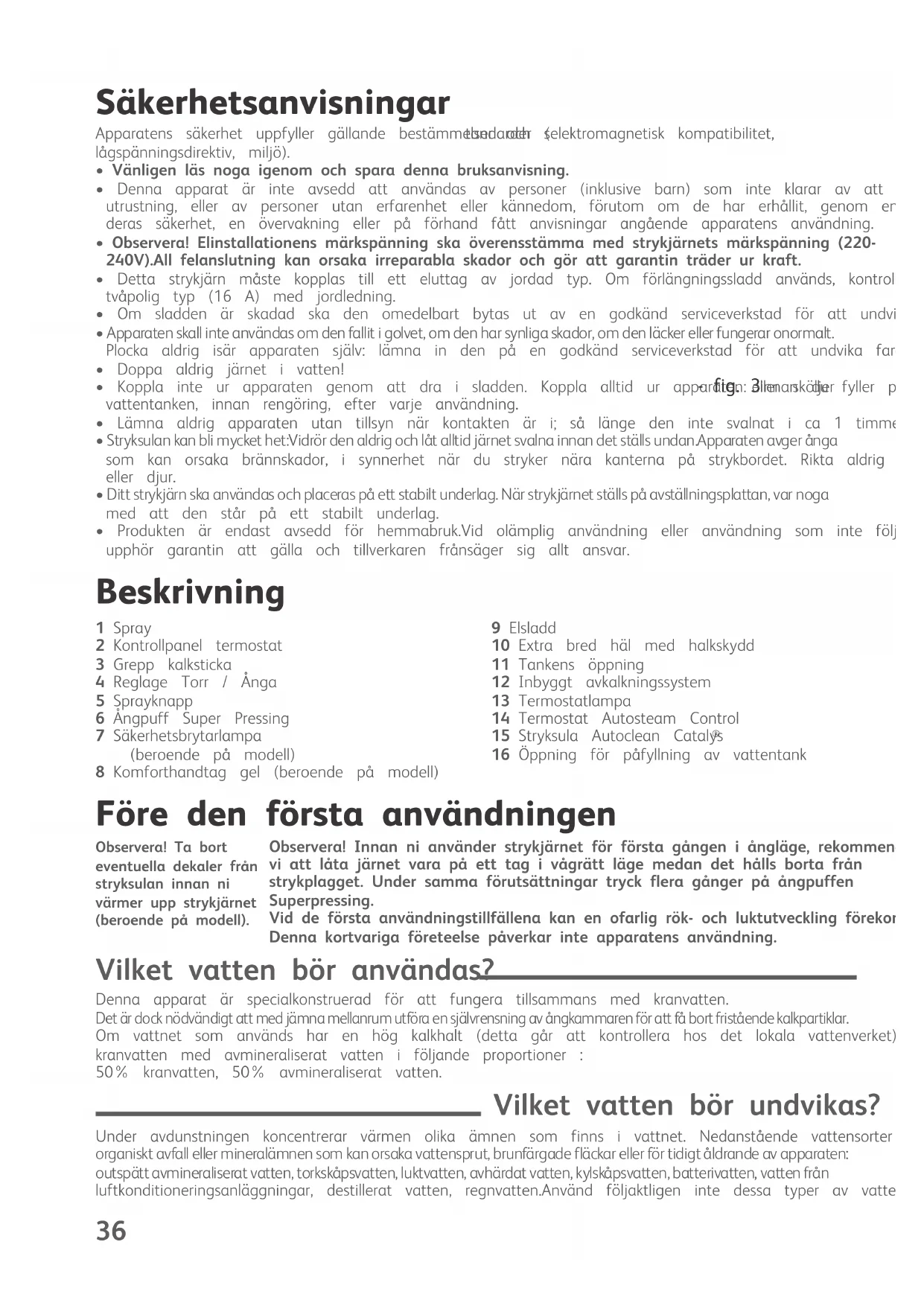 - Apparaten skall inte användas om den fallit i golvet, om den har synliga skador, om den läcker eller fungerar onormalt. Plocka aldrig isär apparaten själv: lämna in den på en godkänd serviceverkstad för att undvika fara.• Doppa aldrig järnet i vatten!• Koppla inte ur apparaten genom att dra i sladden. Koppla alltid ur apparaten: innan du fyller på - fig. 3 eller sköljervattentanken, innan rengöring, efter varje användning.• Lämna aldrig apparaten utan tillsyn när kontakten är i; så länge den inte svalnat i ca 1 timme