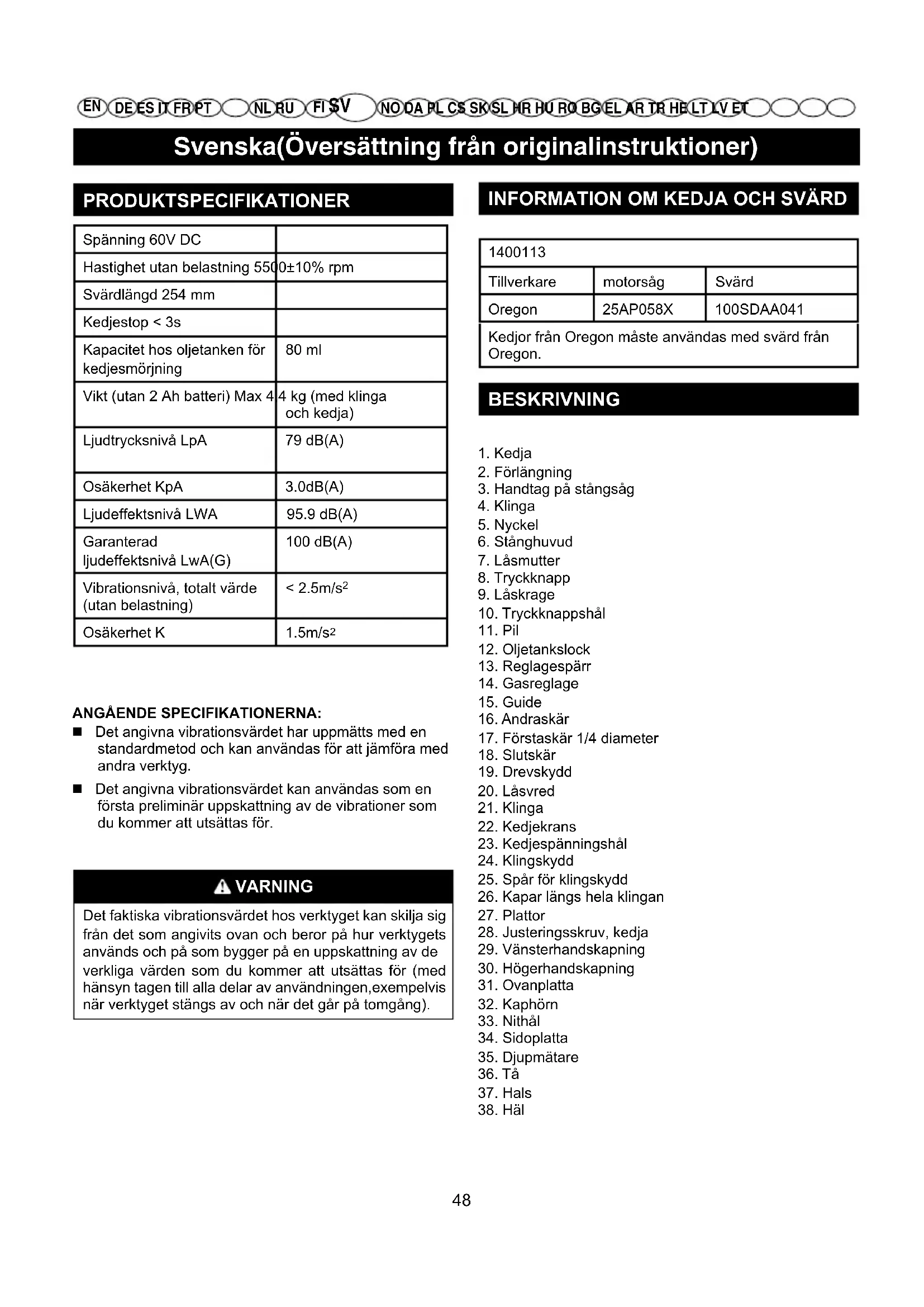 1400113Tillverkare motorsåg SvärdOregon 25AP058X 100SDAA041Kedjor från Oregon måste användas med svärd från Oregon. BESKRIVNING 1. Kedja2. Förlängning3. Handtag på stångsåg4. Klinga5. Nyckel6. Stånghuvud7. Låsmutter8. Tryckknapp9. Låskrage10. Tryckknappshål11. Pil12. Oljetankslock13. Reglagespärr14. Gasreglage15. Guide16. Andraskär17. Förstaskär 1/4 diameter18. Slutskär19. Drevskydd20. Låsvred21. Klinga22. Kedjekrans23. Kedjespänningshål24. Klingskydd25. Spår för klingskydd26. Kapar längs hela klingan27. Plattor28. Justeringsskruv, kedja29. Vänsterhandskapning30. Högerhandskapning31. Ovanplatta32. Kaphörn33. Nithål34. Sidoplatta35. Djupmätare36. Tå37. Hals38. Häl 48Svenska(Översättning från originalinstruktioner)