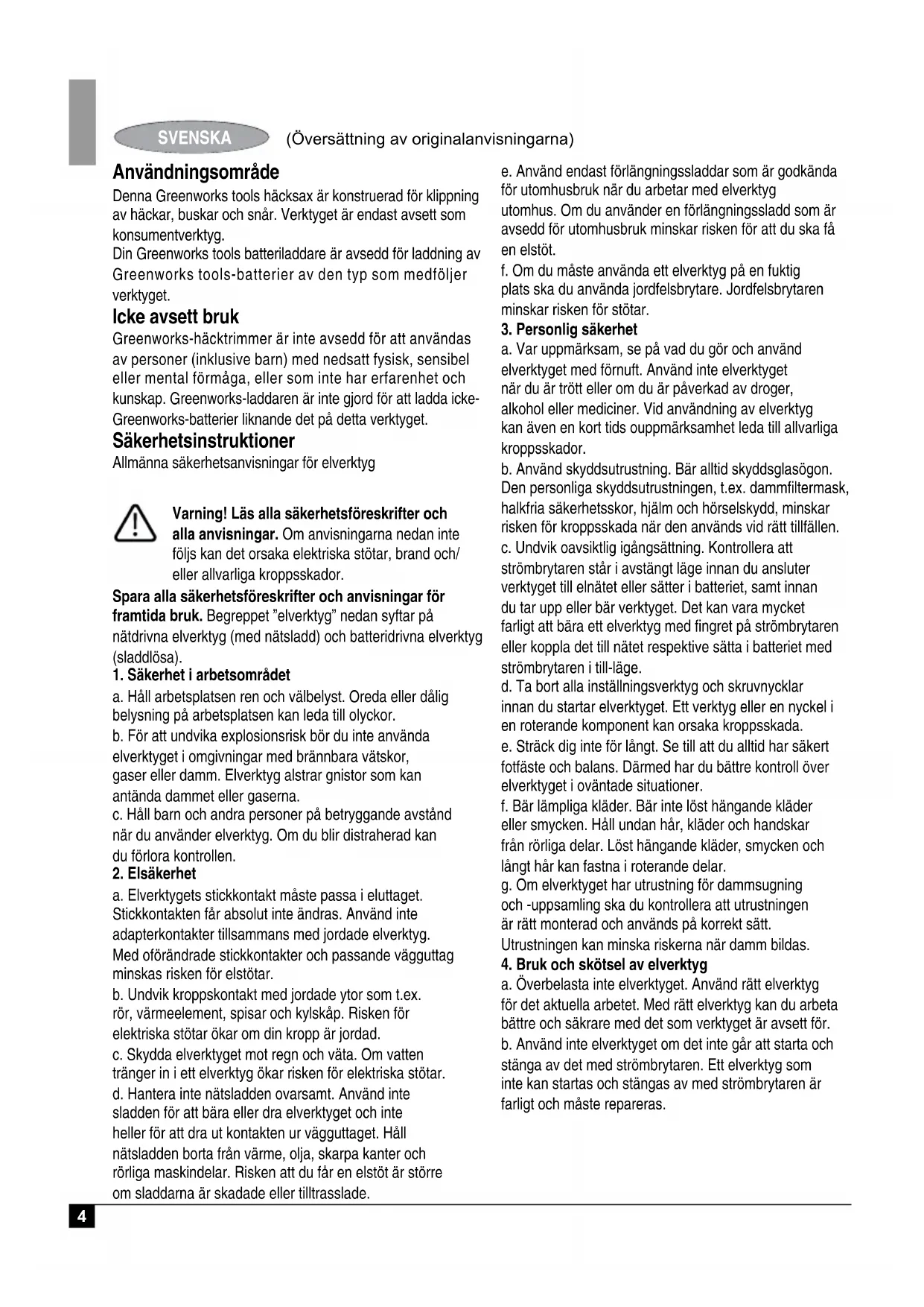 Användningsområde Denna Greenworks tools häcksax är konstruerad för klippning av häckar, buskar och snår. Verktyget är endast avsett som konsumentverktyg. Din Greenworks tools batteriladdare är avsedd för laddning av Greenworks tools-batterier av den typ som medföljer verktyget. Icke avsett bruk Greenworks-häcktrimmer är inte avsedd för att användas av personer (inklusive barn) med nedsatt fysisk, sensibel eller mental förmåga, eller som inte har erfarenhet och kunskap. Greenworks-laddaren är inte gjord för att ladda icke- Greenworks-batterier liknande det på detta verktyget. Säkerhetsinstruktioner Allmänna säkerhetsanvisningar för elverktyg Varning! Läs alla säkerhetsföreskrifter och alla anvisningar. Om anvisningarna nedan inte följs kan det orsaka elektriska stötar, brand och/ eller allvarliga kroppsskador. SVENSKA Spara alla säkerhetsföreskrifter och anvisningar för framtida bruk. Begreppet ”elverktyg” nedan syftar på nätdrivna elverktyg (med nätsladd) och batteridrivna elverktyg (sladdlösa).