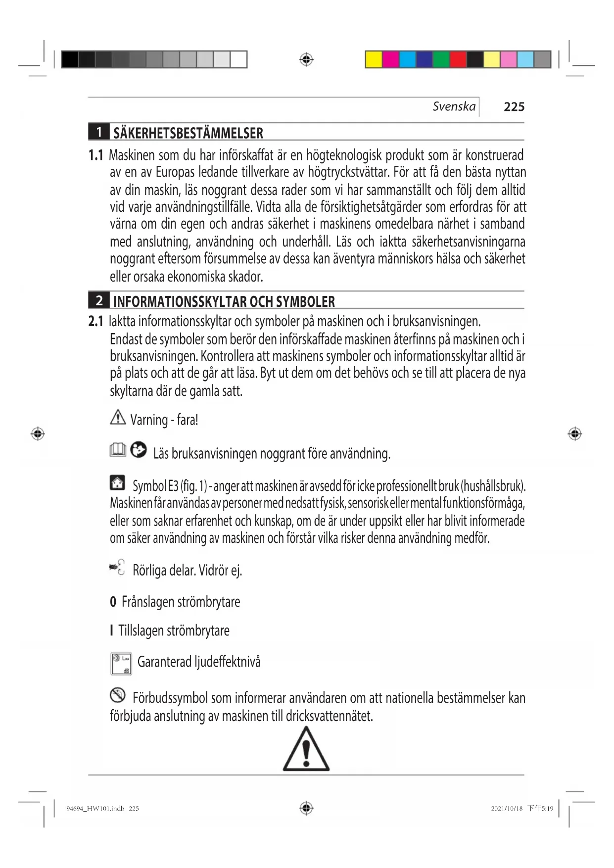 Endast de symboler som berör den införskaffade maskinen återfinns på maskinen och i bruksanvisningen. Kontrollera att maskinens symboler och informationsskyltar alltid är på plats och att de går att läsa. Byt ut dem om det behövs och se till att placera de nya skyltarna där de gamla satt. Varning - fara! Läs bruksanvisningen noggrant före användning. Symbol E3 (fig. 1) - anger att maskinen är avsedd för icke professionellt bruk (hushållsbruk). Maskinen får användas av personer med nedsatt fysisk, sensorisk eller mental funktionsförmåga, eller som saknar erfarenhet och kunskap, om de är under uppsikt eller har blivit informerade om säker användning av maskinen och förstår vilka risker denna användning medför. Rörliga delar. Vidrör ej. 0 Frånslagen strömbrytare I Tillslagen strömbrytare Garanterad ljudeffektnivå Förbudssymbol som informerar användaren om att nationella bestämmelser kan förbjuda anslutning av maskinen till dricksvattennätet. 94694_HW101.indb 22594694_HW101.indb 225 2021/10/18 下午5:192021/10/18 下午5:19226 Svenska Varningssymbol som påminner användaren om att inte rikta vattenstrålen mot personer, djur, elutrustning eller den använda maskinen. Maskinen tillhör isolerklass II. Det betyder att den är försedd med en förstärkt eller dubbel isolering (endast om symbolen finns på maskinen). Maskinen är i överensstämmelse med gällande EU-direktiv. Symbol E1 - anger att maskinen inte får bortskaffas som hushållsavfall. Maskinen kan lämnas tillbaka till återförsäljaren vid inköp av en ny maskin. Maskinens elektriska och elektroniska komponenter får inte återanvändas för otillåtna ändamål eftersom de innehåller hälsovådliga ämnen. Gäller endast inom EU P.g.a. förekomsten av farliga komponenter i utrustningen kan begagnad elektrisk och elektronisk utrustning ha negativ inverkan på miljön och människors hälsa. Kassera inte elektriska och elektroniska apparater ihop med hushållsavfall! I enlighet med EU-direktivet om avfall som utgörs av eller innehåller elektrisk och elektronisk utrustning, och dess införlivande i nationell lagstiftning, bör begagnad elektrisk och elektronisk utrustning samlas in separat och transporteras till en särskild uppsamlingsplats för kommunalt avfall, som drivs i enlighet med regelverket för miljöskydd. Detta anges av symbolen med den överkryssade soptunnan på hjul som sitter på utrustningen. Använd hörselskydd. Använd skyddsmask. Använd andningsskydd. Använd skyddshandskar. Använd skyddsskor. Använd skyddskläder. 94694_HW101.indb 22694694_HW101.indb 226 2021/10/18 下午5:192021/10/18 下午5:19227 Svenska