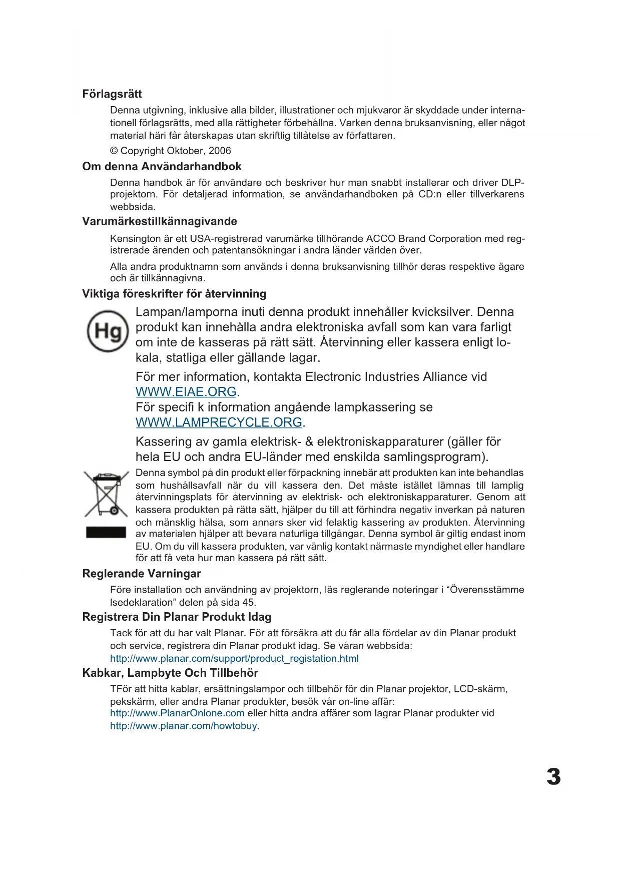 Planar Systems, Inc. Корпоративный Штаб 1195 NW Compton Drive, USA Beaverton, OR 97006-1992 Planar Поддержка Клиента Телефон: США: 1-866-PLANAR1 (866) 752-6271 Внутри США: +1 (503) 748-5799 E-mail: PlanarSupport@planar.com Онлайн Техническая Библиотека: http://www.planar.com/support Часы: M-F, 8am - 8pm ET, 12pm - 12am GMT3 Förlagsrätt Denna utgivning, inklusive alla bilder, illustrationer och mjukvaror är skyddade under interna- tionell förlagsrätts, med alla rättigheter förbehållna. Varken denna bruksanvisning, eller något material häri får återskapas utan skriftlig tillåtelse av författaren. © Copyright Oktober, 2006 Om denna Användarhandbok Denna handbok är för användare och beskriver hur man snabbt installerar och driver DLP- projektorn. För detaljerad information, se användarhandboken på CD:n eller tillverkarens webbsida. Varumärkestillkännagivande Kensington är ett USA-registrerad varumärke tillhörande ACCO Brand Corporation med reg- istrerade ärenden och patentansökningar i andra länder världen över. Alla andra produktnamn som används i denna bruksanvisning tillhör deras respektive ägare och är tillkännagivna. Viktiga föreskrifter för återvinning Lampan/lamporna inuti denna produkt innehåller kvicksilver. Denna produkt kan innehålla andra elektroniska avfall som kan vara farligt om inte de kasseras på rätt sätt. Återvinning eller kassera enligt lo- kala, statliga eller gällande lagar. För mer information, kontakta Electronic Industries Alliance vid WWW.EIAE.ORG. För specifi k information angående lampkassering se WWW.LAMPRECYCLE.ORG. Kassering av gamla elektrisk- & elektroniskapparaturer (gäller för hela EU och andra EU-länder med enskilda samlingsprogram). Denna symbol på din produkt eller förpackning innebär att produkten kan inte behandlas som hushållsavfall när du vill kassera den. Det måste istället lämnas till lamplig återvinningsplats för återvinning av elektrisk- och elektroniskapparaturer. Genom att kassera produkten på rätta sätt, hjälper du till att förhindra negativ inverkan på naturen och mänsklig hälsa, som annars sker vid felaktig kassering av produkten. Återvinning av materialen hjälper att bevara naturliga tillgångar. Denna symbol är giltig endast inom EU. Om du vill kassera produkten, var vänlig kontakt närmaste myndighet eller handlare för att få veta hur man kassera på rätt sätt. Reglerande Varningar Före installation och användning av projektorn, läs reglerande noteringar i “Överensstämme lsedeklaration” delen på sida 45. Registrera Din Planar Produkt Idag Tack för att du har valt Planar. För att försäkra att du får alla fördelar av din Planar produkt och service, registrera din Planar produkt idag. Se våran webbsida: http://www.planar.com/support/product_registation.html Kabkar, Lampbyte Och Tillbehör TFör att hitta kablar, ersättningslampor och tillbehör för din Planar projektor, LCD-skärm, pekskärm, eller andra Planar produkter, besök vår on-line affär: http://www.PlanarOnlone.com eller hitta andra affärer som lagrar Planar produkter vid http://www.planar.com/howtobuy.4