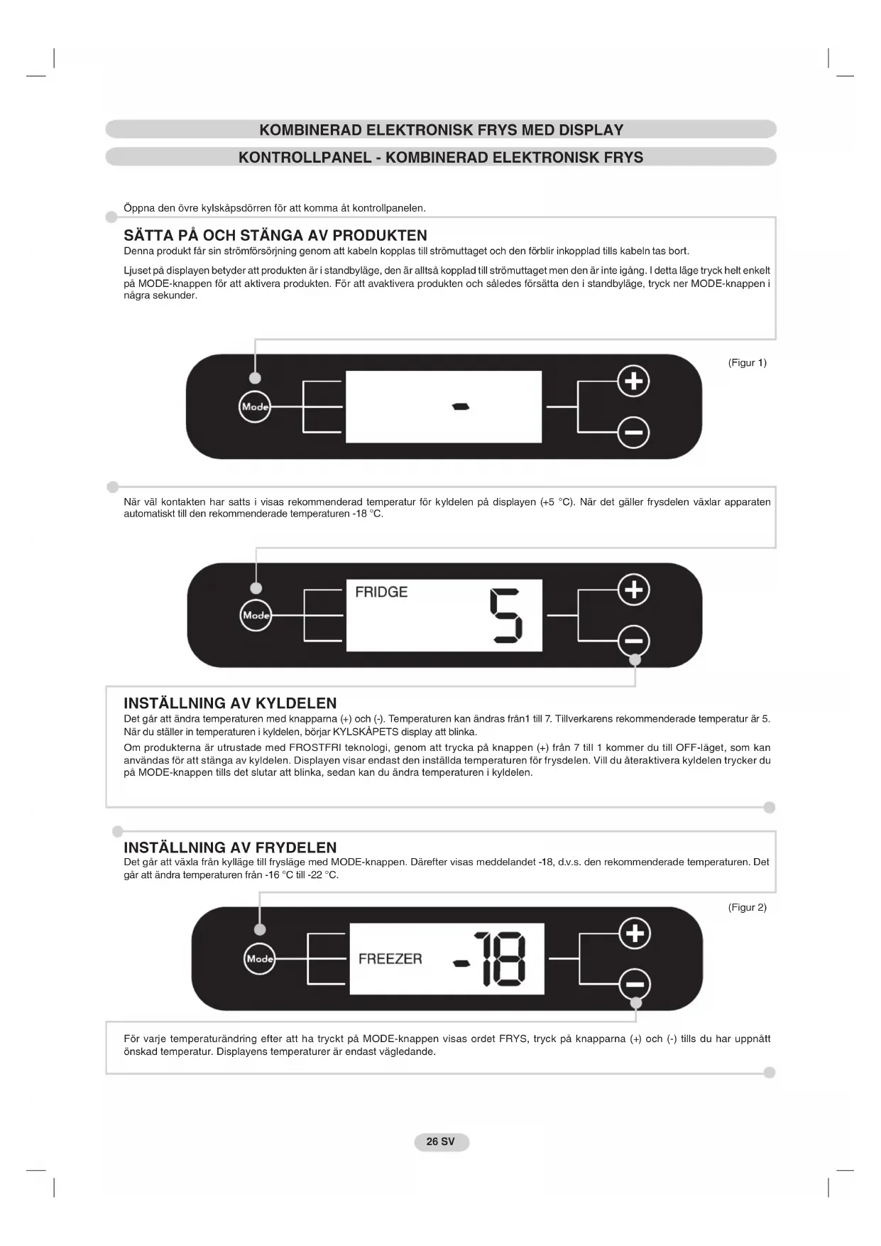 Det går att ändra temperaturen med knapparna (+) och (-). Temperaturen kan ändras från1 till 7. Tillverkarens rekommenderade temperatur är 5. När du ställer in temperaturen i kyldelen, börjar KYLSKÅPETS display att blinka. Om produkterna är utrustade med FROSTFRI teknologi, genom att trycka på knappen (+) från 7 till 1 kommer du till OFF-läget, som kan användas för att stänga av kyldelen. Displayen visar endast den inställda temperaturen för frysdelen. Vill du återaktivera kyldelen trycker du på MODE-knappen tills det slutar att blinka, sedan kan du ändra temperaturen i kyldelen.