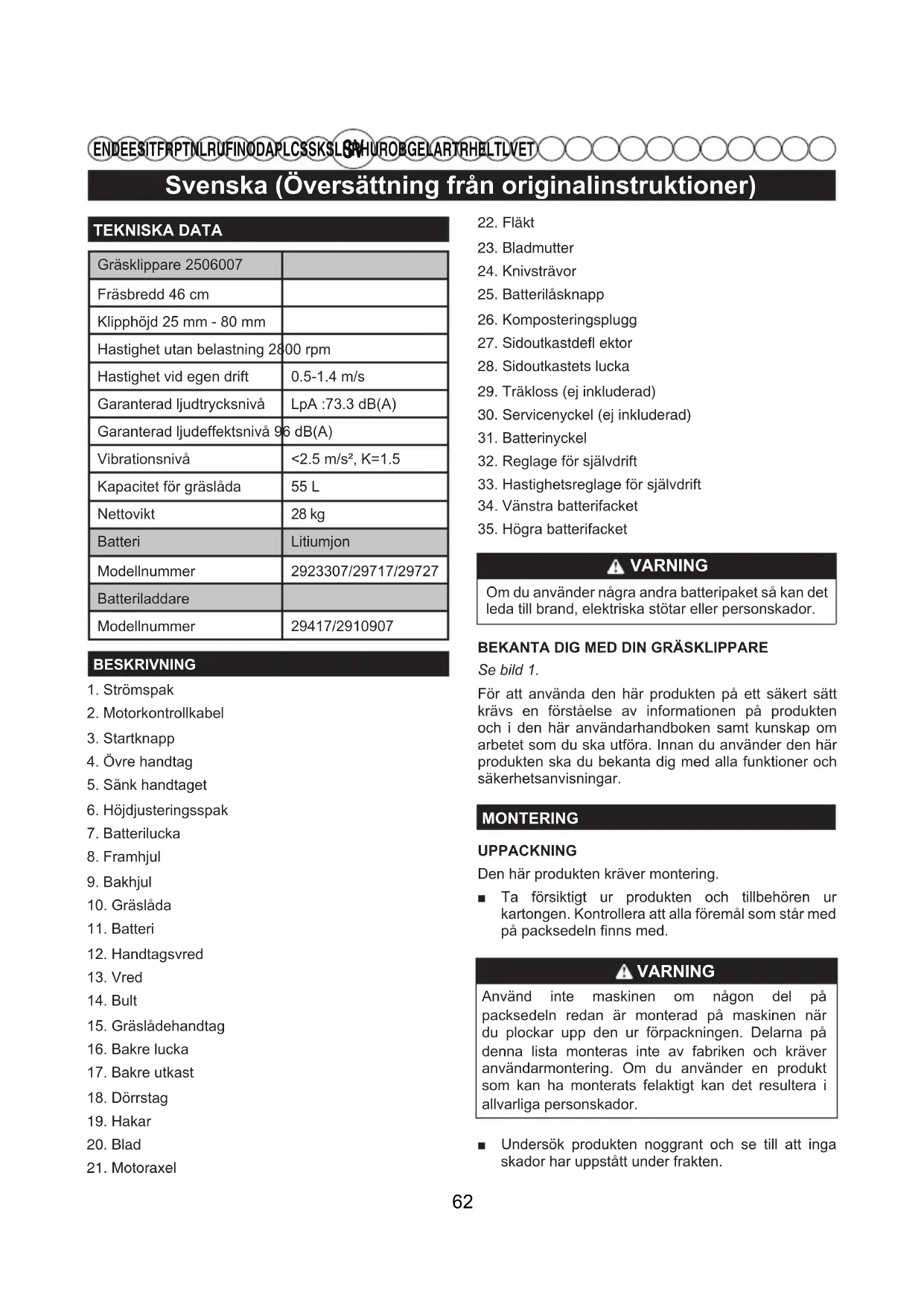 EN DE ES IT FR PT NL RU FI NO DA PL CS SK SL HR HU RO BG EL AR TR HE LT LV ET TEKNISKA DATAGräsklippare 2506007Fräsbredd 46 cmKlipphöjd 25 mm - 80 mmHastighet utan belastning 2800 rpmHastighet vid egen drift 0.5-1.4 m/sGaranterad ljudtrycksnivå LpA :73.3 dB(A)Garanterad ljudeffektsnivå 96 dB(A)Vibrationsnivå <2.5 m/s², K=1.5Kapacitet för gräslåda 55 LNettovikt 28 kgBatteri LitiumjonModellnummer 2923307/29717/29727BatteriladdareModellnummer 29417/2910907BESKRIVNING1. Strömspak2. Motorkontrollkabel3. Startknapp4. Övre handtag5. Sänk handtaget6. Höjdjusteringsspak7. Batterilucka8. Framhjul9. Bakhjul10. Gräslåda11. Batteri12. Handtagsvred13. Vred14. Bult15. Gräslådehandtag16. Bakre lucka17. Bakre utkast18. Dörrstag19. Hakar20. Blad21. Motoraxel22. Fläkt23. Bladmutter24. Knivsträvor25. Batterilåsknapp26. Komposteringsplugg27. Sidoutkastdefl ektor28. Sidoutkastets lucka29. Träkloss (ej inkluderad)30. Servicenyckel (ej inkluderad)31. Batterinyckel32. Reglage för självdrift 33. Hastighetsreglage för självdrift34. Vänstra batterifacket35. Högra batterifacket VARNING Om du använder några andra batteripaket så kan det leda till brand, elektriska stötar eller personskador. BEKANTA DIG MED DIN GRÄSKLIPPARESe bild 1.För att använda den här produkten på ett säkert sätt krävs en förståelse av informationen på produkten och i den här användarhandboken samt kunskap om arbetet som du ska utföra. Innan du använder den här produkten ska du bekanta dig med alla funktioner och säkerhetsanvisningar.MONTERINGUPPACKNINGDen här produkten kräver montering. ■ Ta försiktigt ur produkten och tillbehören ur kartongen. Kontrollera att alla föremål som står med på packsedeln finns med. VARNING Använd inte maskinen om någon del på packsedeln redan är monterad på maskinen när du plockar upp den ur förpackningen. Delarna på denna lista monteras inte av fabriken och kräver användarmontering. Om du använder en produkt som kan ha monterats felaktigt kan det resultera i allvarliga personskador. ■ Undersök produkten noggrant och se till att inga skador har uppstått under frakten. 62Svenska (Översättning från originalinstruktioner)