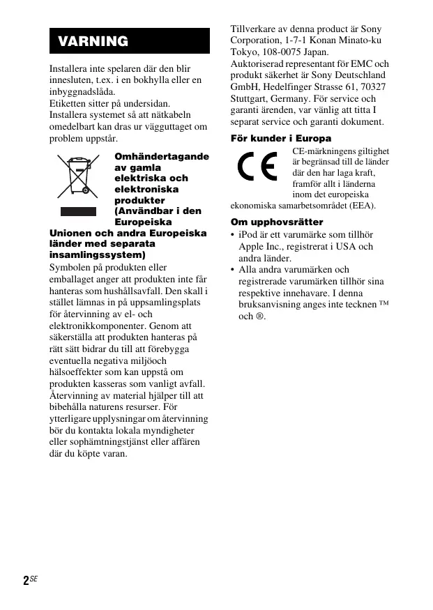 - Se ”Kompatibla iPod-modeller” (sid. 3). Fortsättning 11SE Försiktighetsåtgärder Om säkerhet Rengöring av enheten Stäng av systemet och dra ut stickkontakten ur vägguttaget om du skulle råka tappa något föremål eller spilla vätska in i systemet. Låt en kvalificerad reparatör besiktiga systemet innan du använder det igen. Rengör enheten med en trasa lätt fuktad med en mild rengöringslösning. Använd aldrig någon form av skursvampar, skurpulver eller lösningsmedel som thinner, bensin eller sprit. Om placering